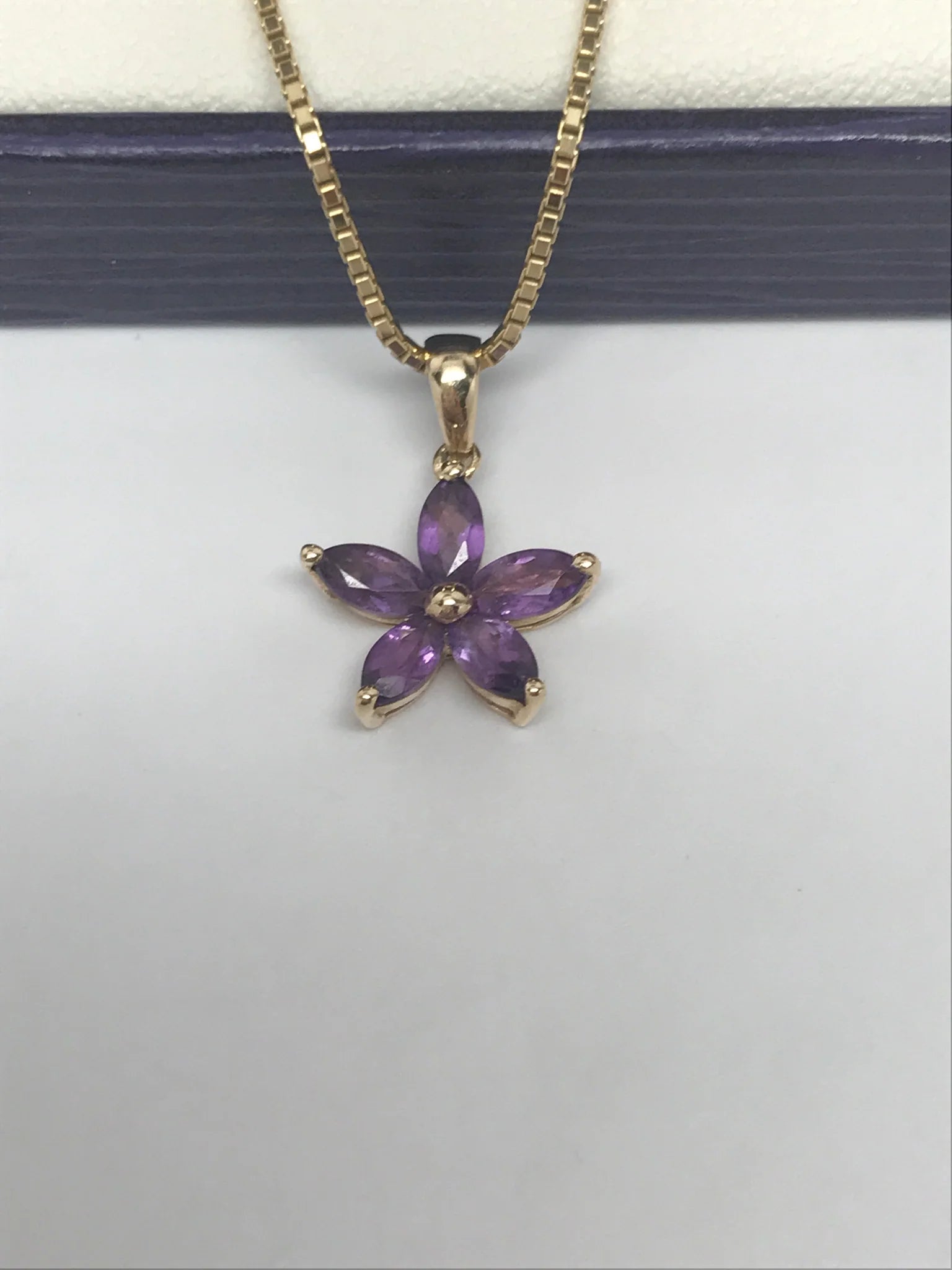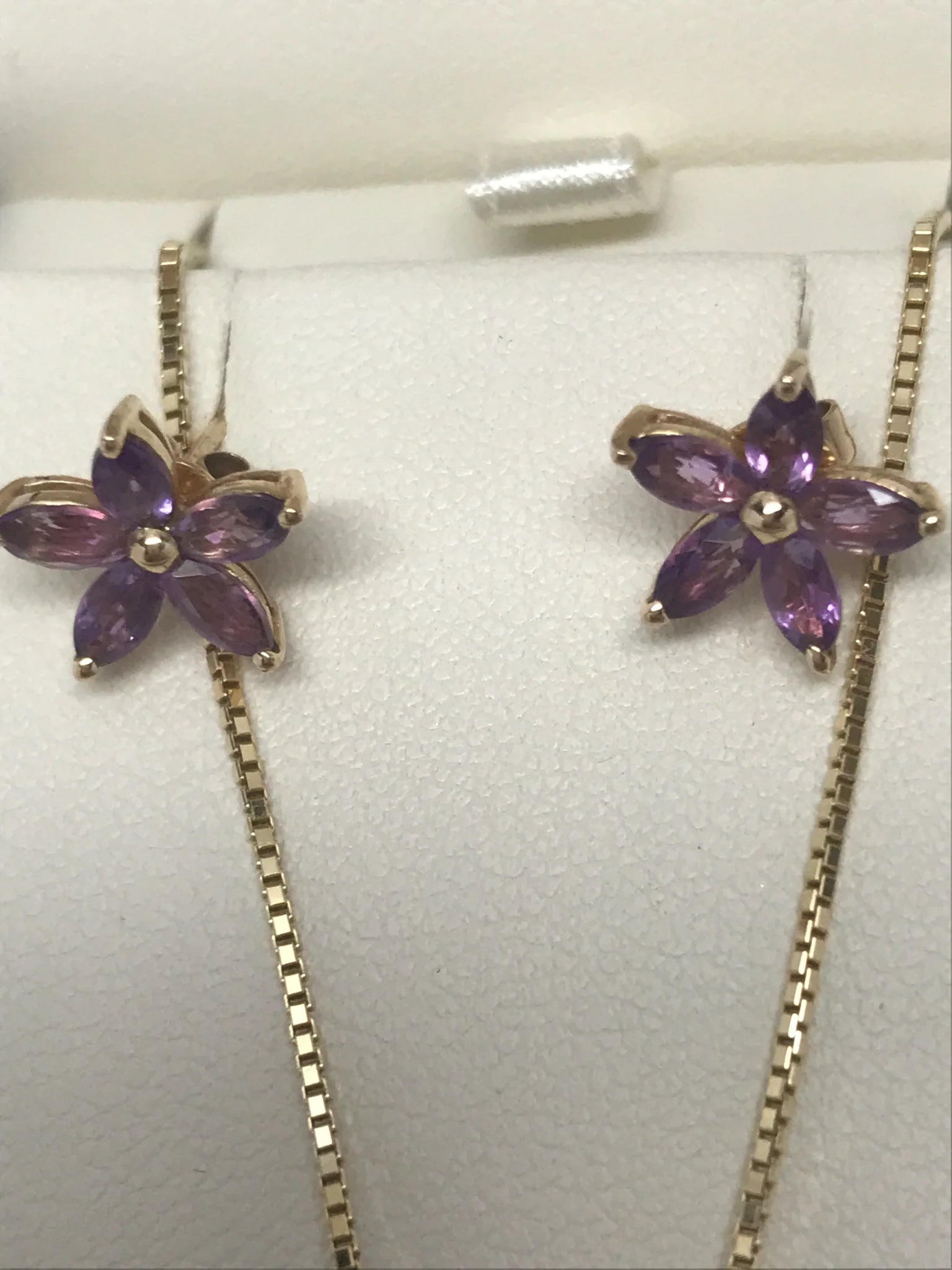 Stunning earrings and necklace set are the perfect gift for that special someone. 10 K yellow gold, faceted amethyst flower accent. Excellent condition - 9.5/10 - includes box and purchase receipt.Share
