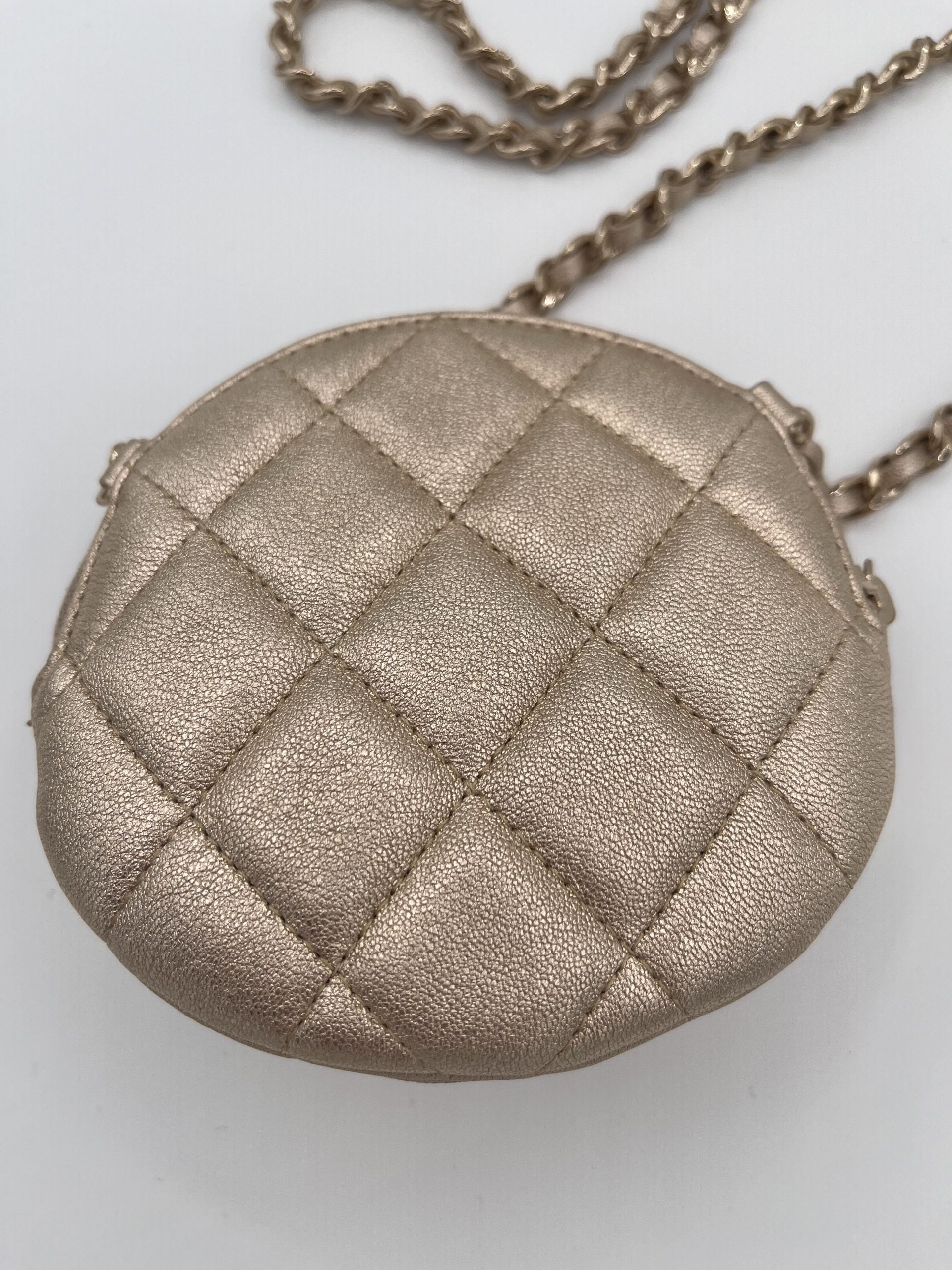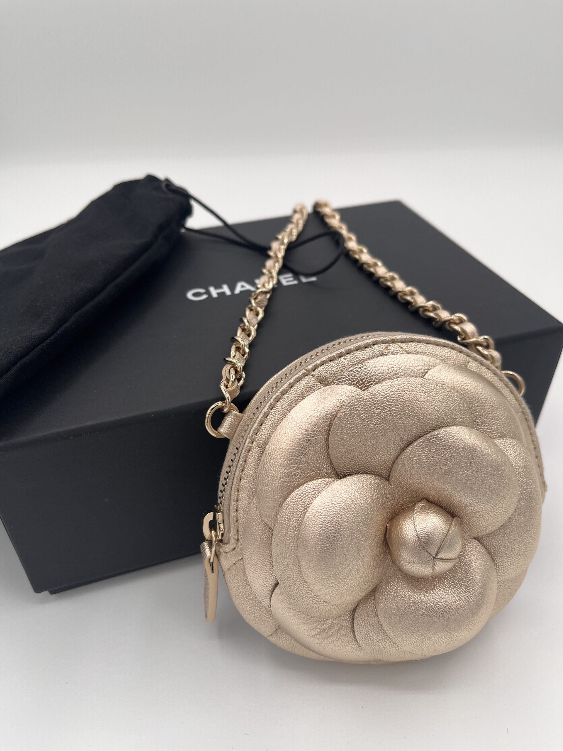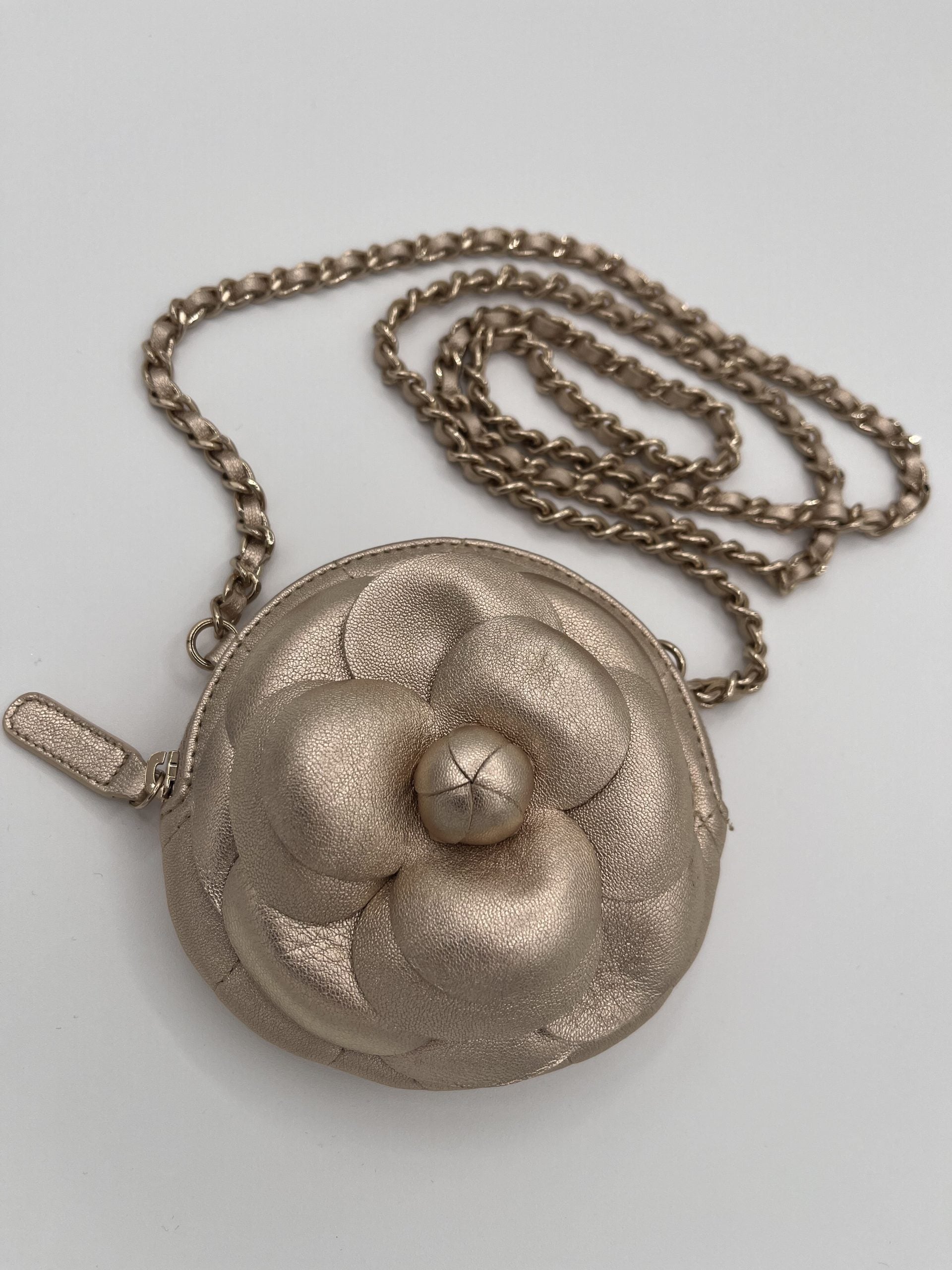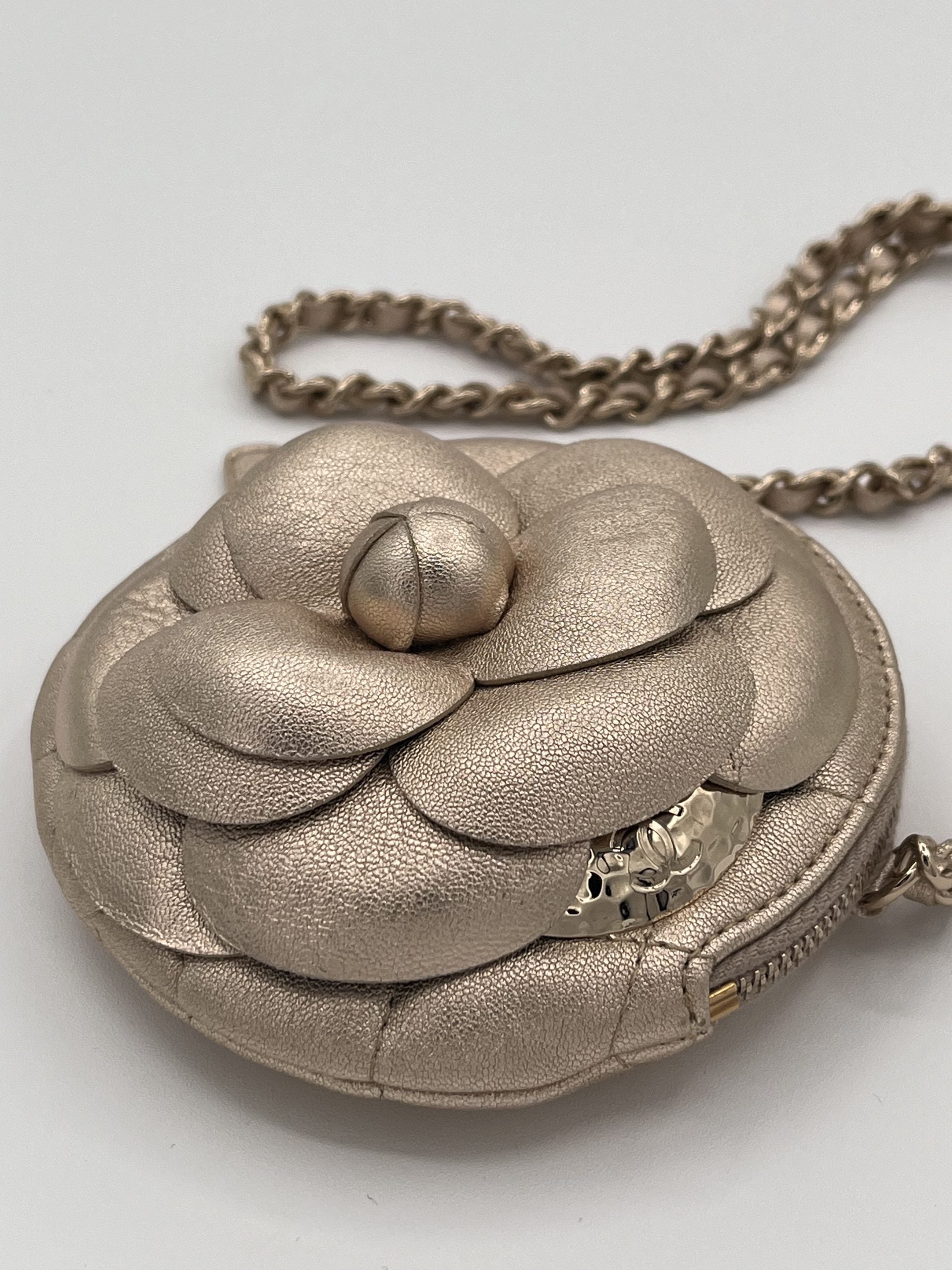 Chanel Camellia Round Clutch with Chain in Gold Calfskin
