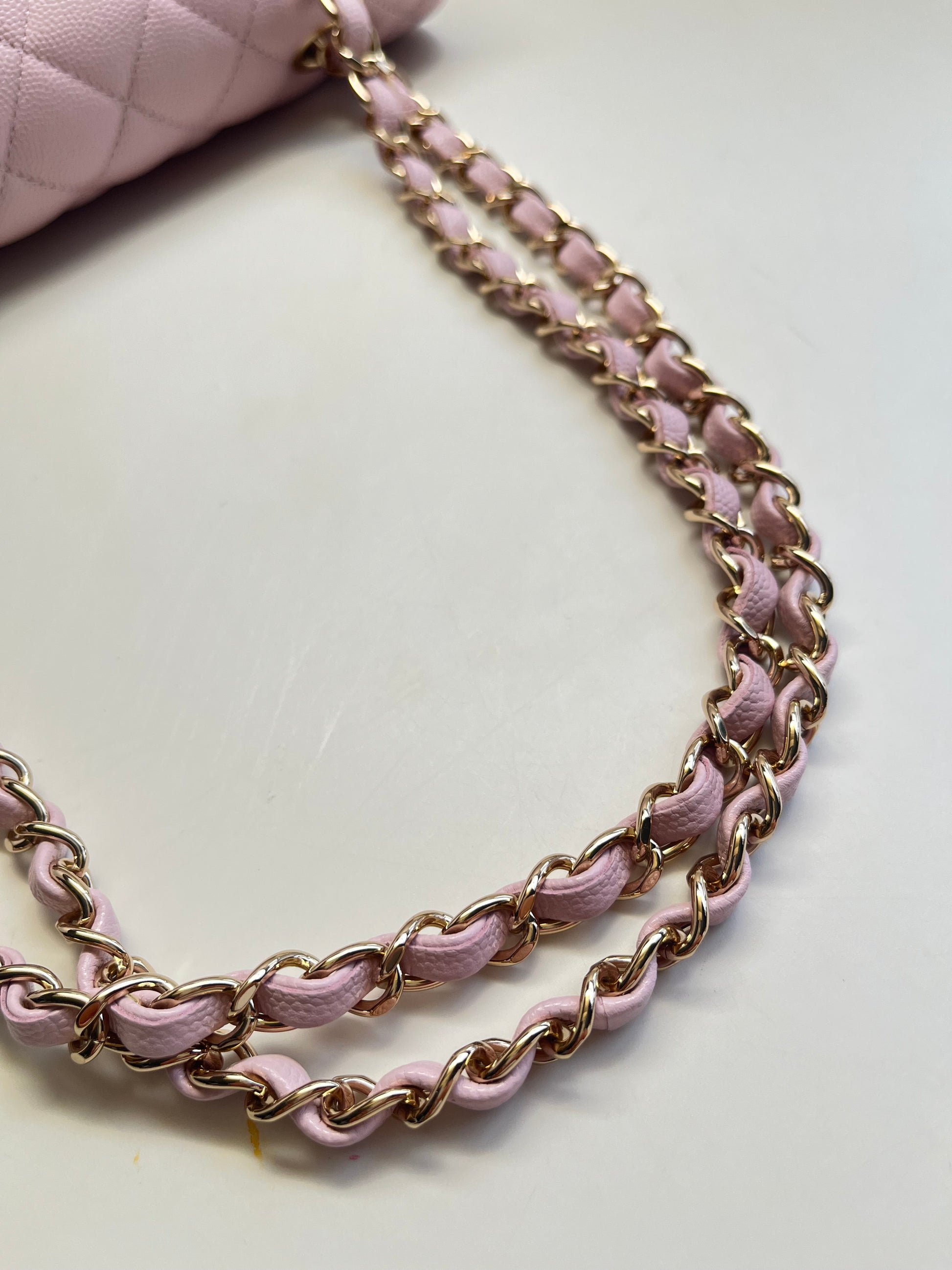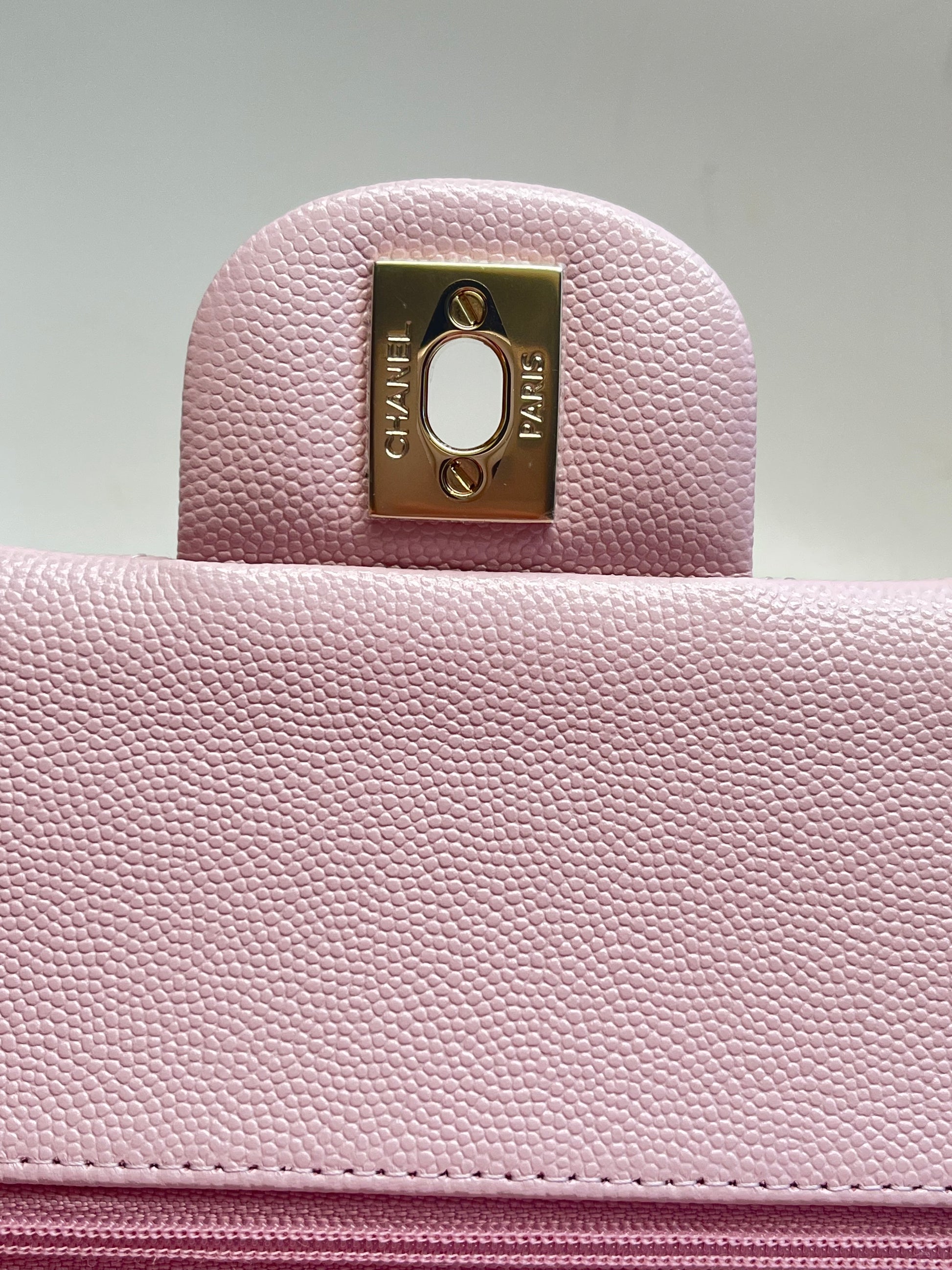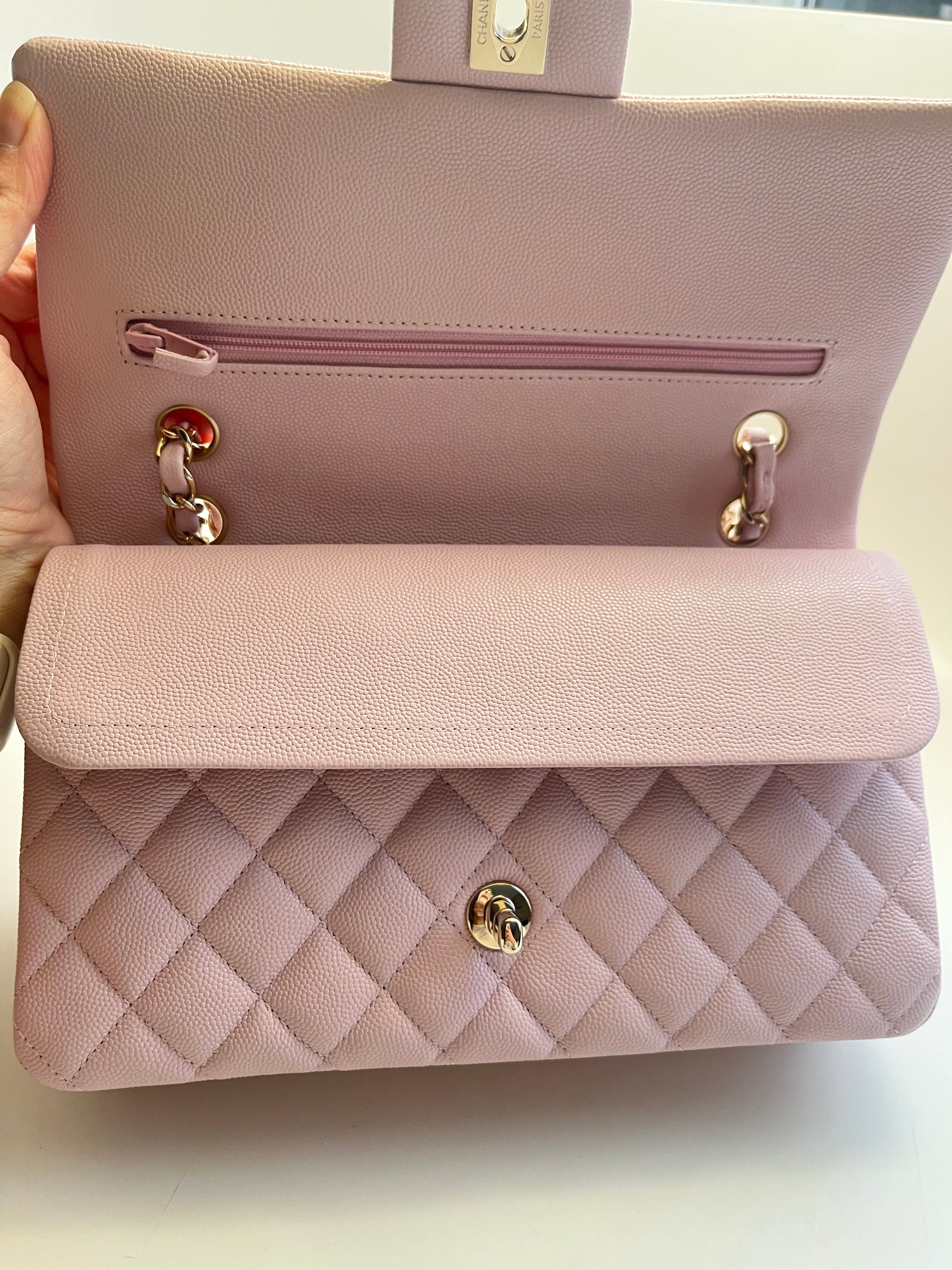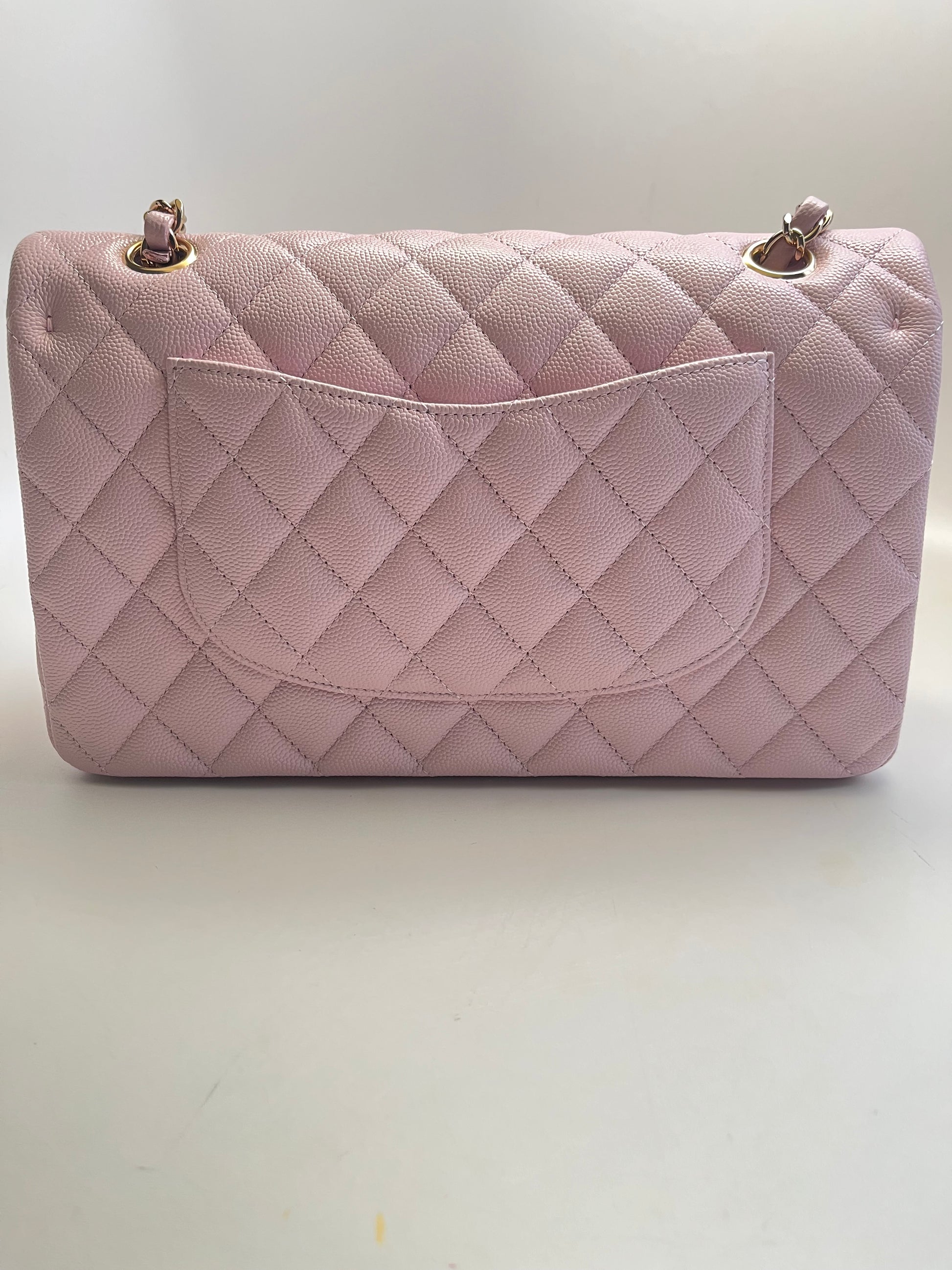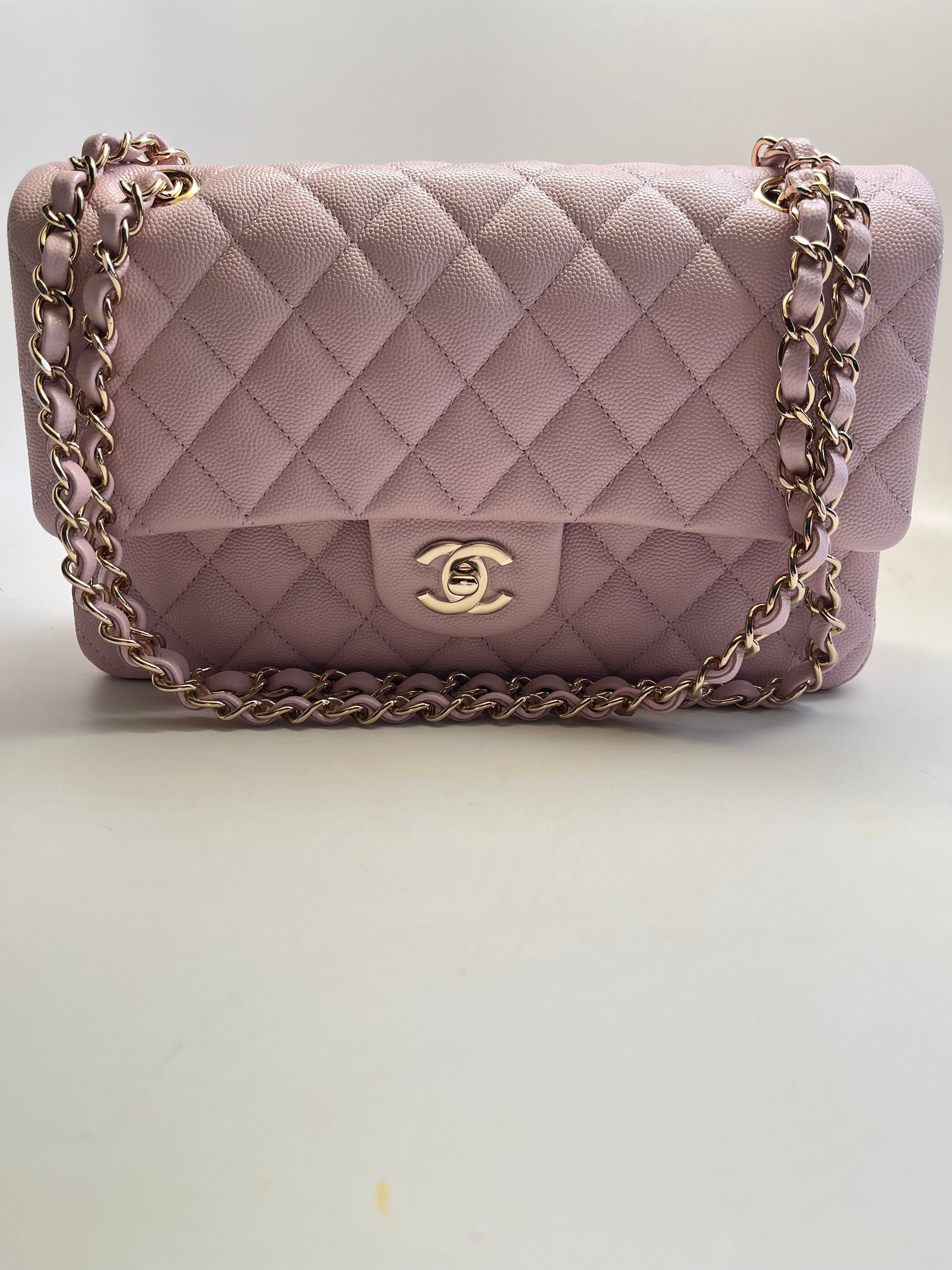 The iconic Chanel Classic Double Flap Bag in a luxurious light pink caviar leather is a must have! It features a CC turn-lock closure, light gold tone hardware, and the signature interwoven chain link shoulder strap. The medium size is perfect to carry all your essentials. This beauty is from the 21S collection.