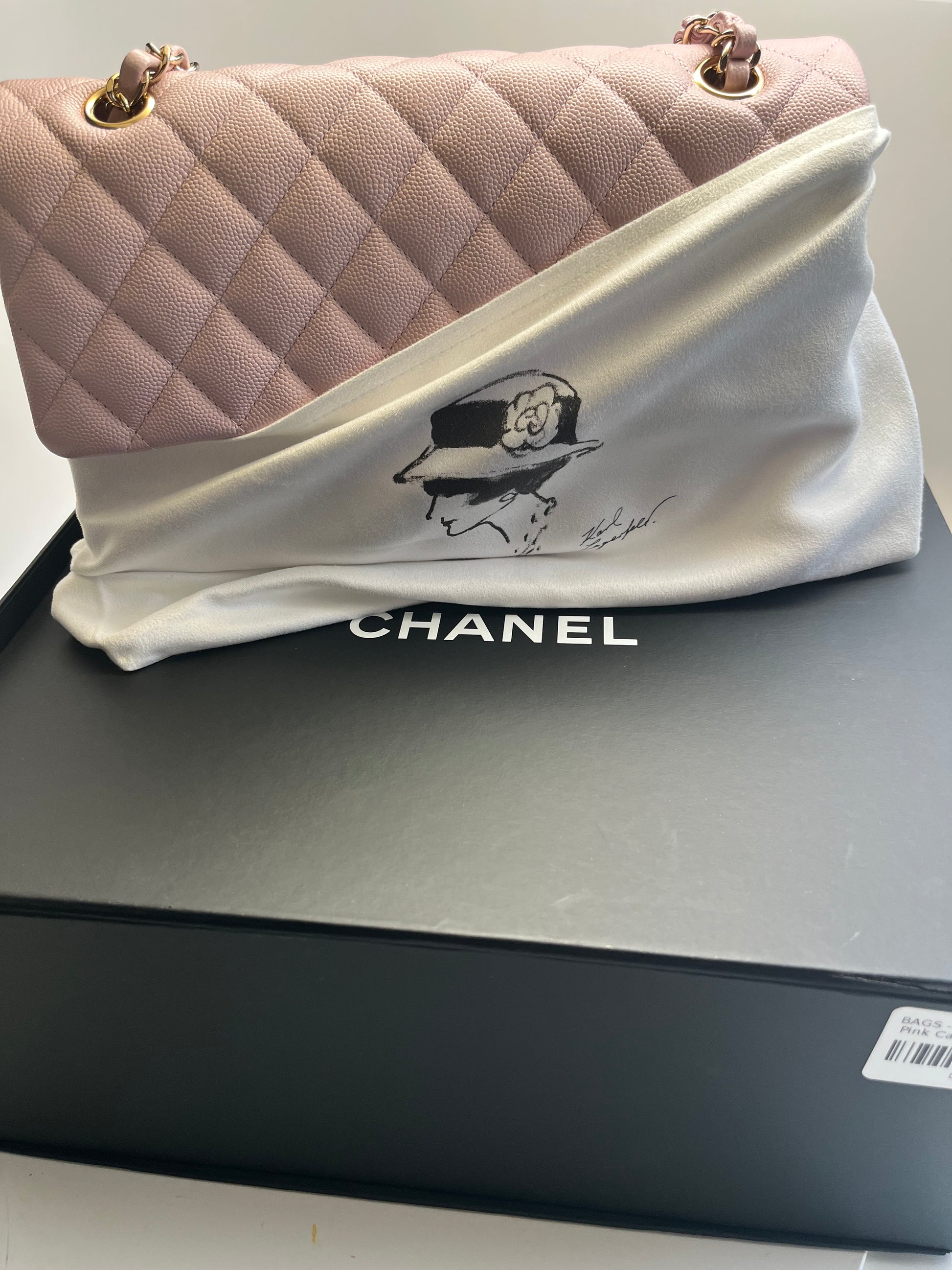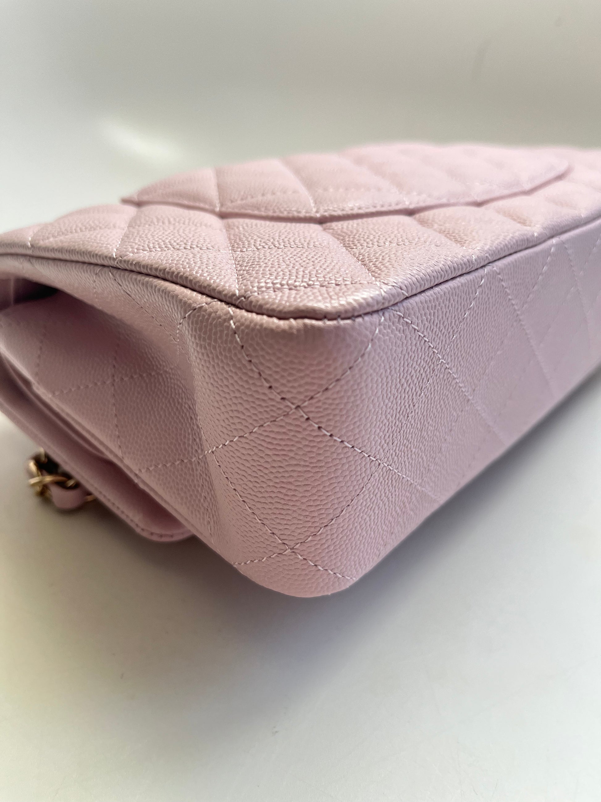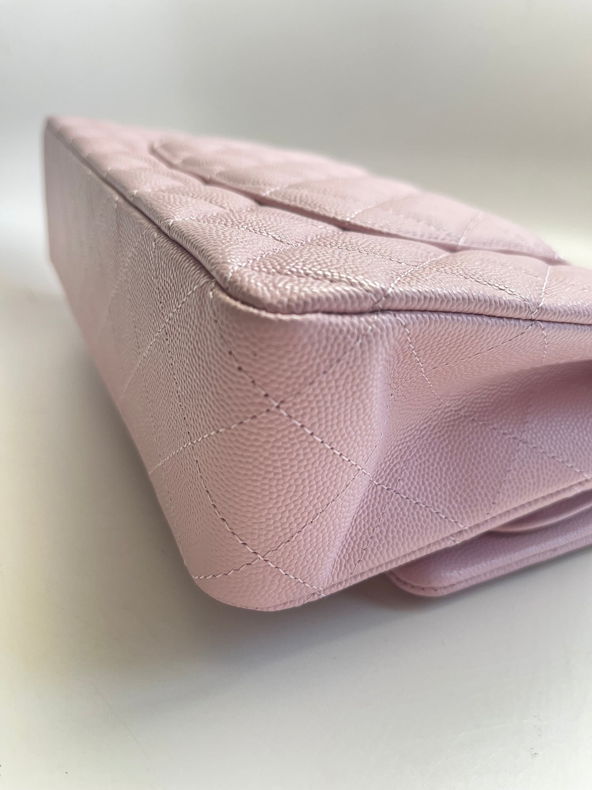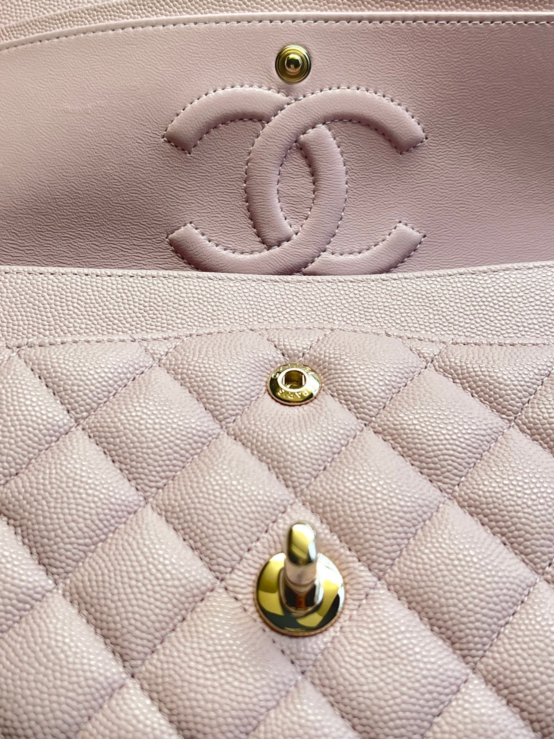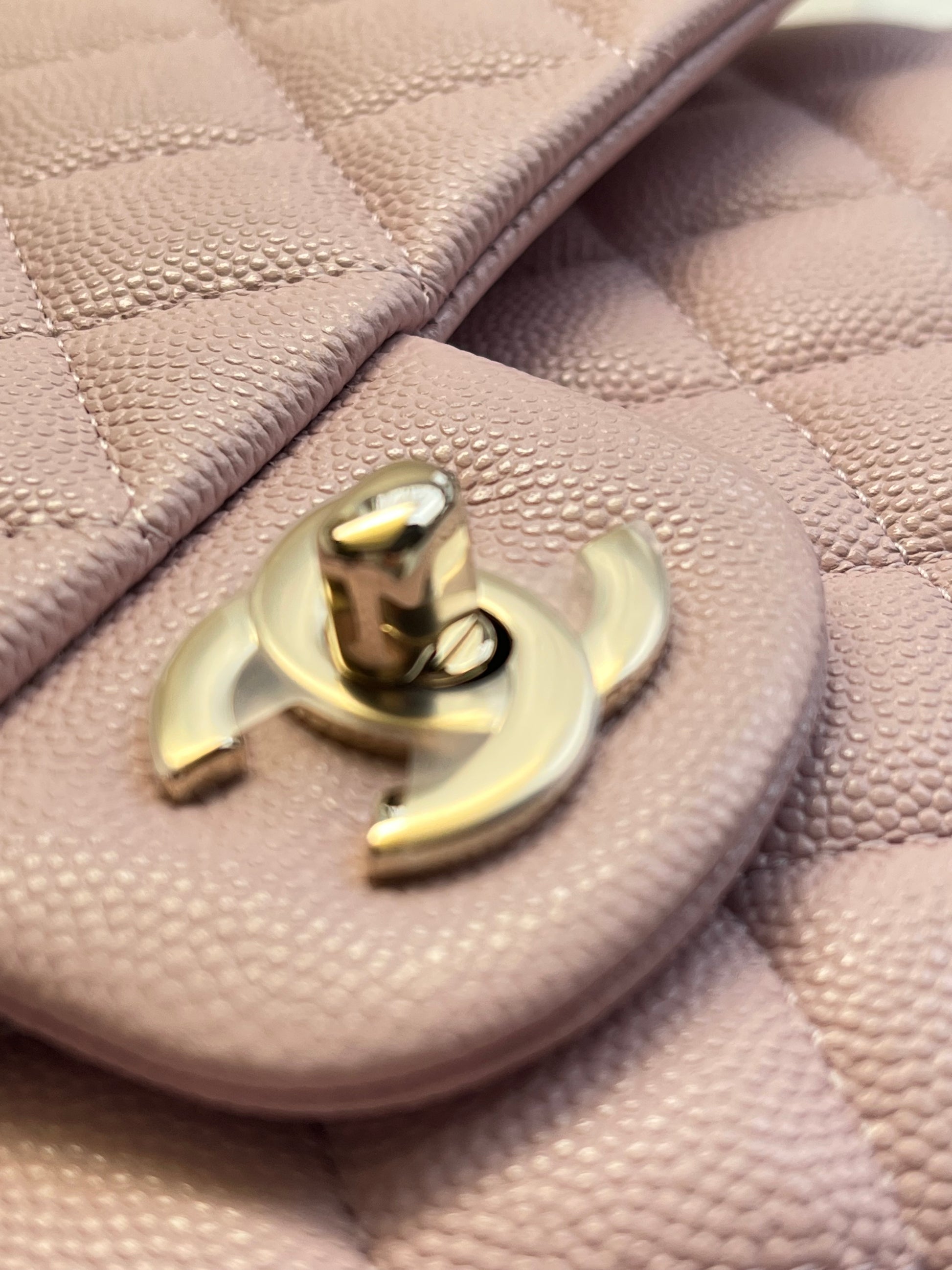 The iconic Chanel Classic Double Flap Bag in a luxurious light pink caviar leather is a must have! It features a CC turn-lock closure, light gold tone hardware, and the signature interwoven chain link shoulder strap. The medium size is perfect to carry all your essentials. This beauty is from the 21S collection.