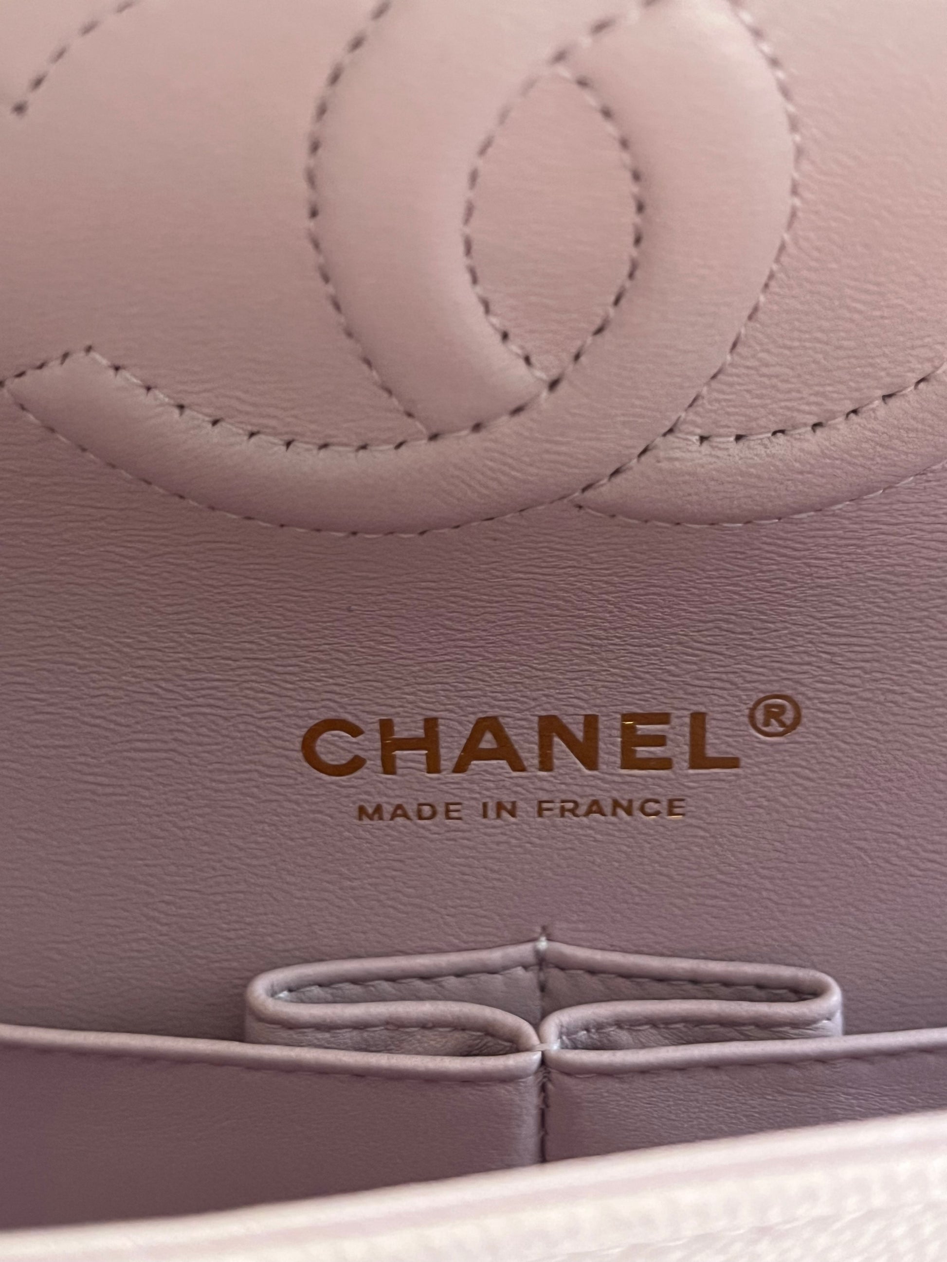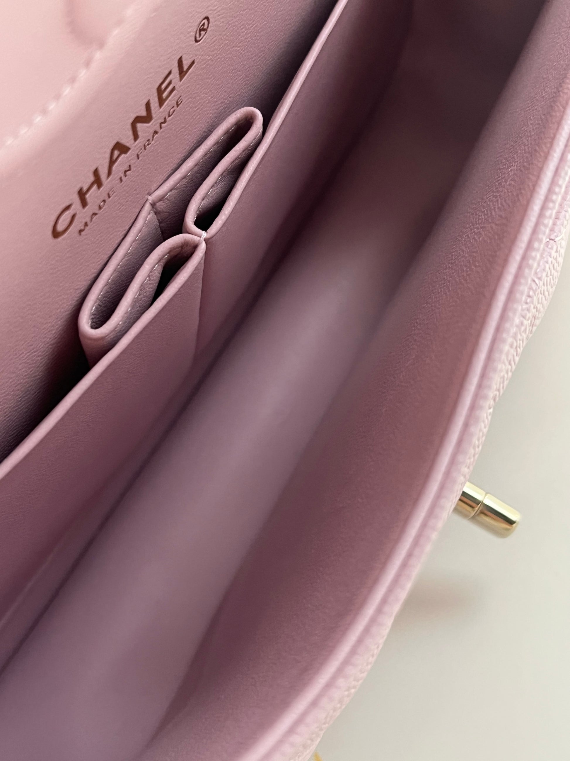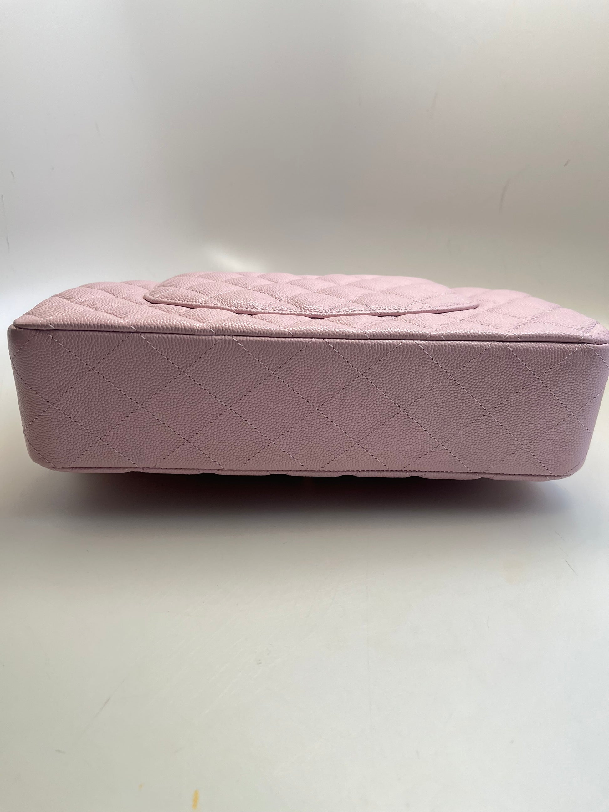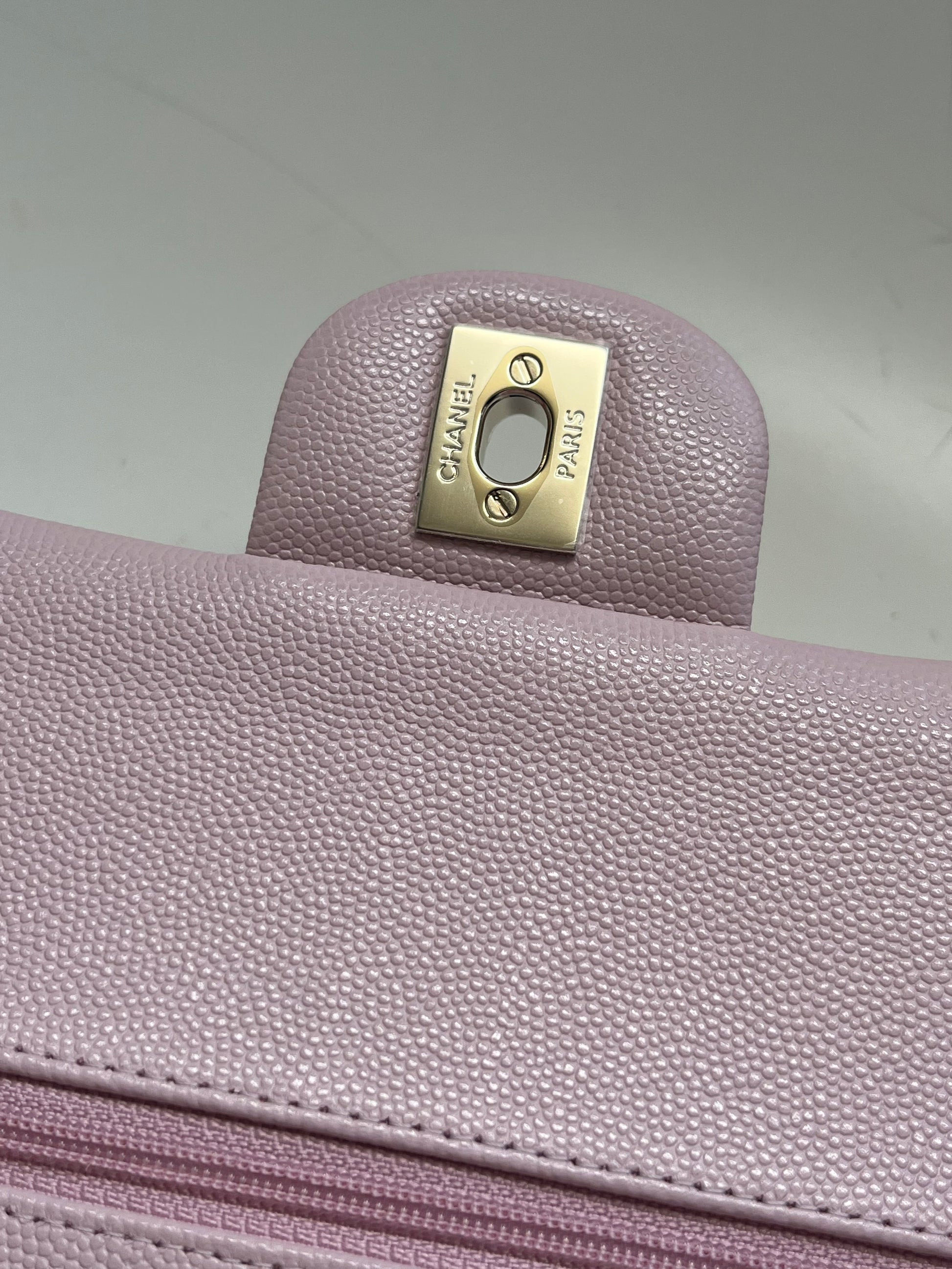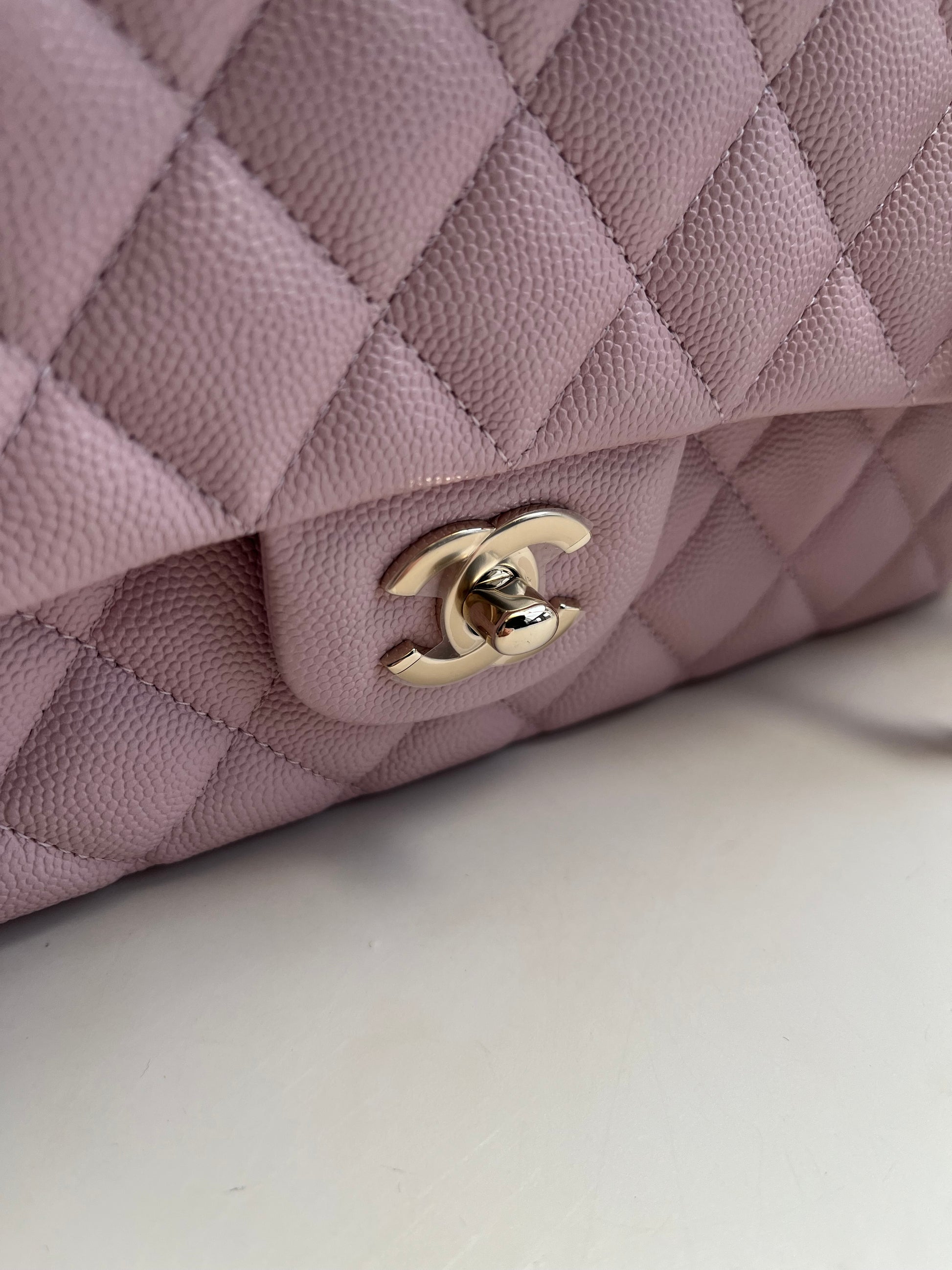 The iconic Chanel Classic Double Flap Bag in a luxurious light pink caviar leather is a must have! It features a CC turn-lock closure, light gold tone hardware, and the signature interwoven chain link shoulder strap. The medium size is perfect to carry all your essentials. This beauty is from the 21S collection.