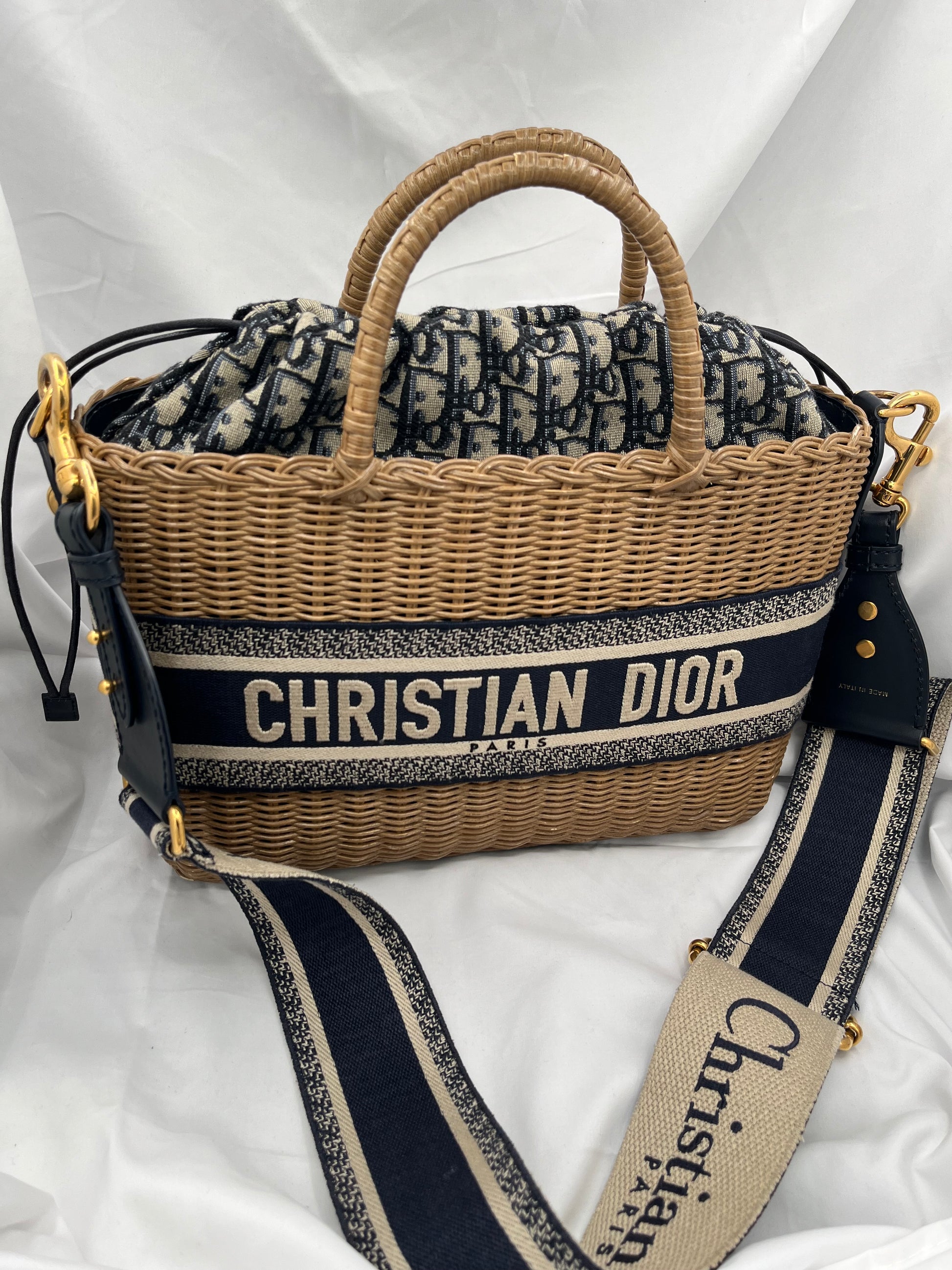 The epitome of elegance and beauty, add this Christian Dior Wicker Basket bag to your Lady Dior collection today! Traditionally crafted in natural hand woven wicker, features the timeless blue Oblique Jacquard interior pouch with drawstring, and Christian Dior Paris embroidered band and iconic gold-tone DIOR charms.