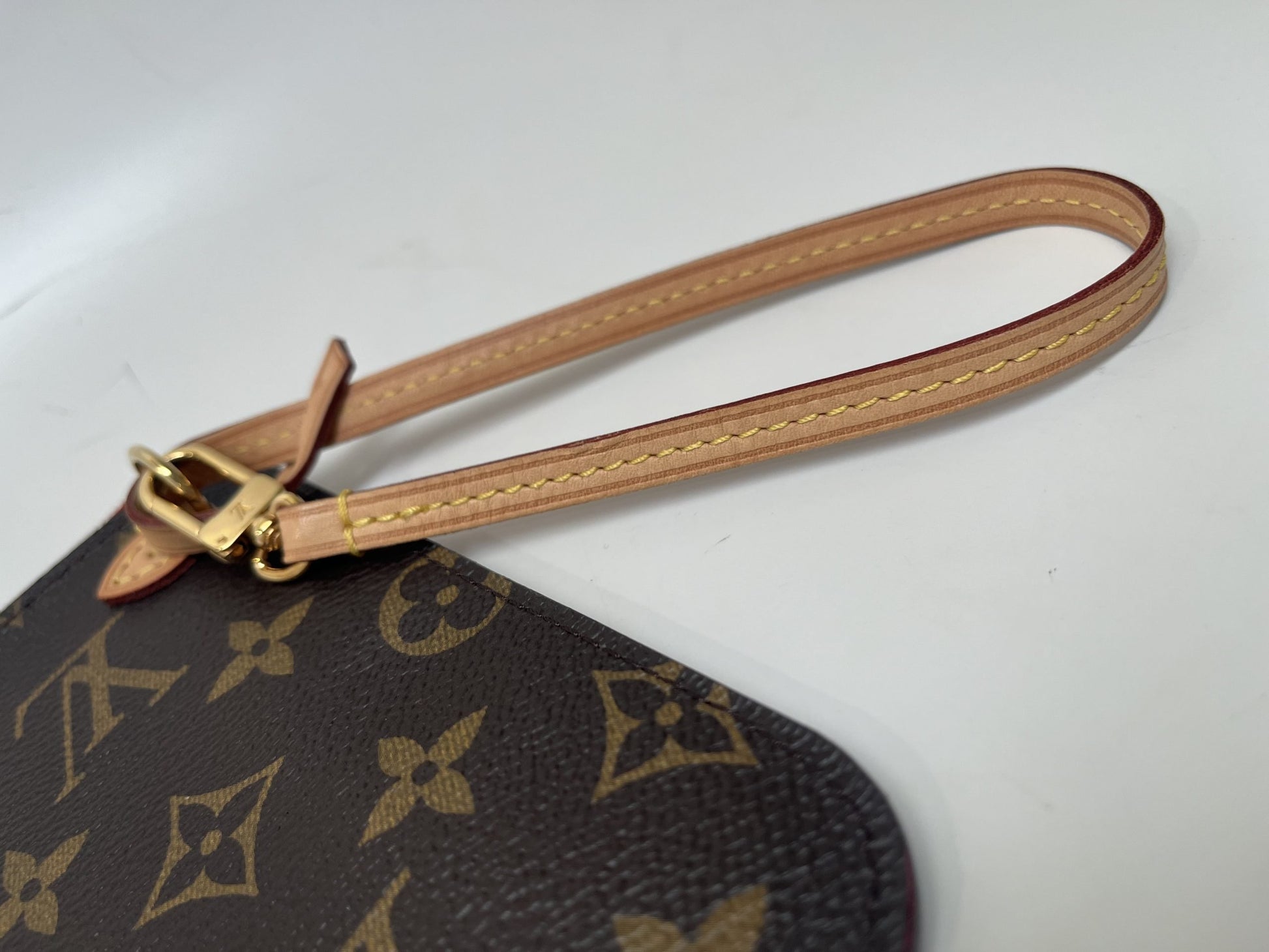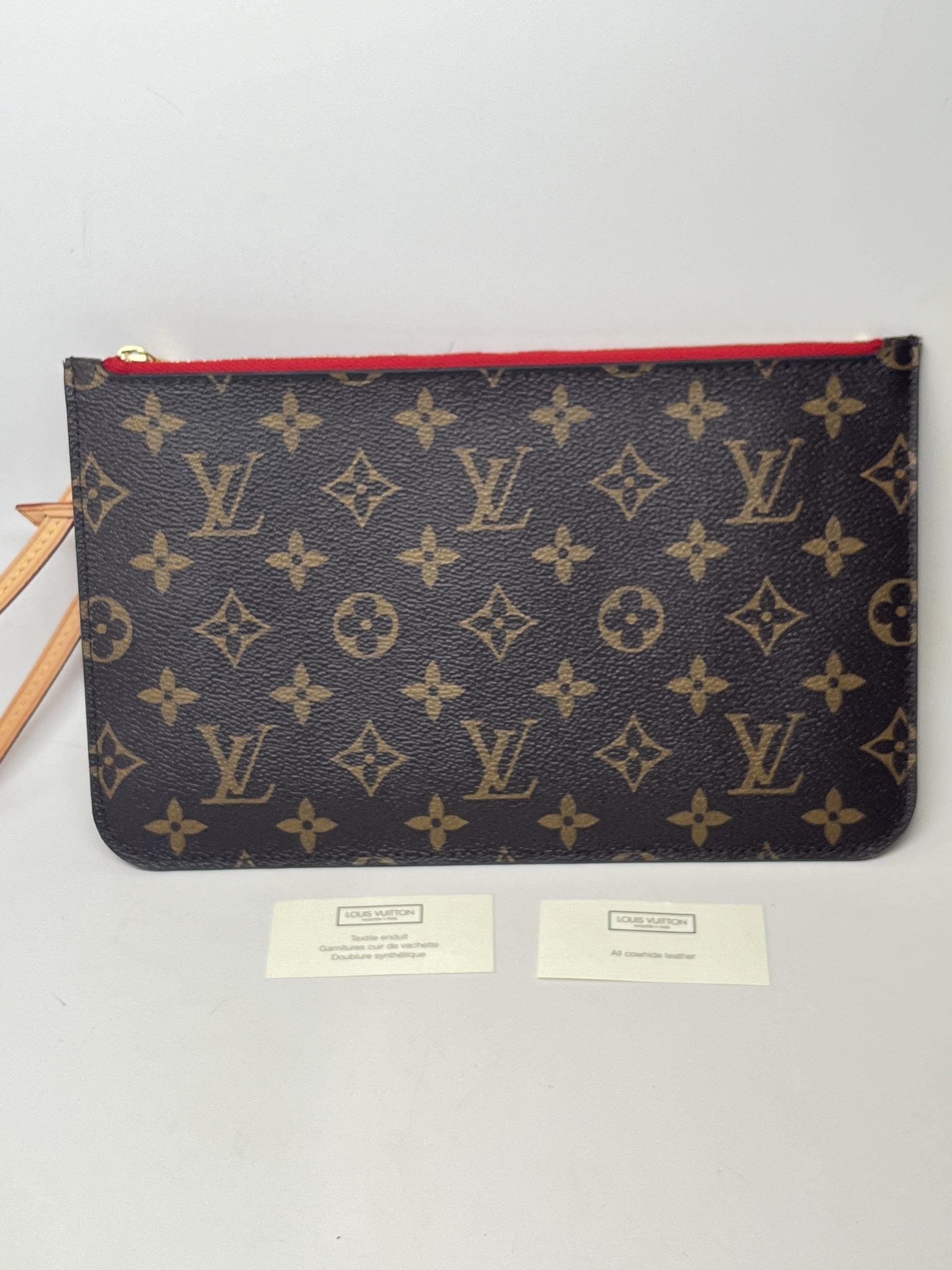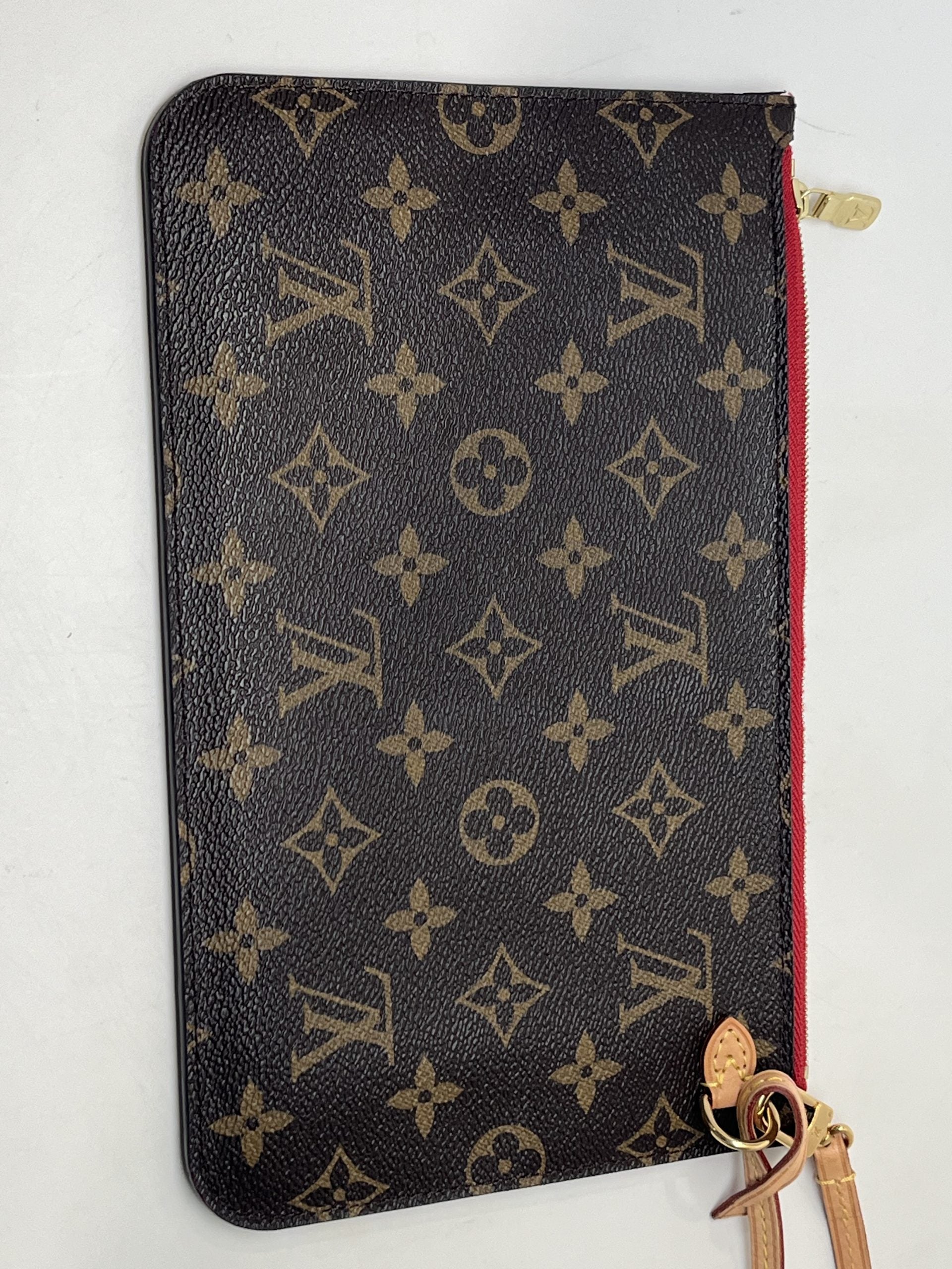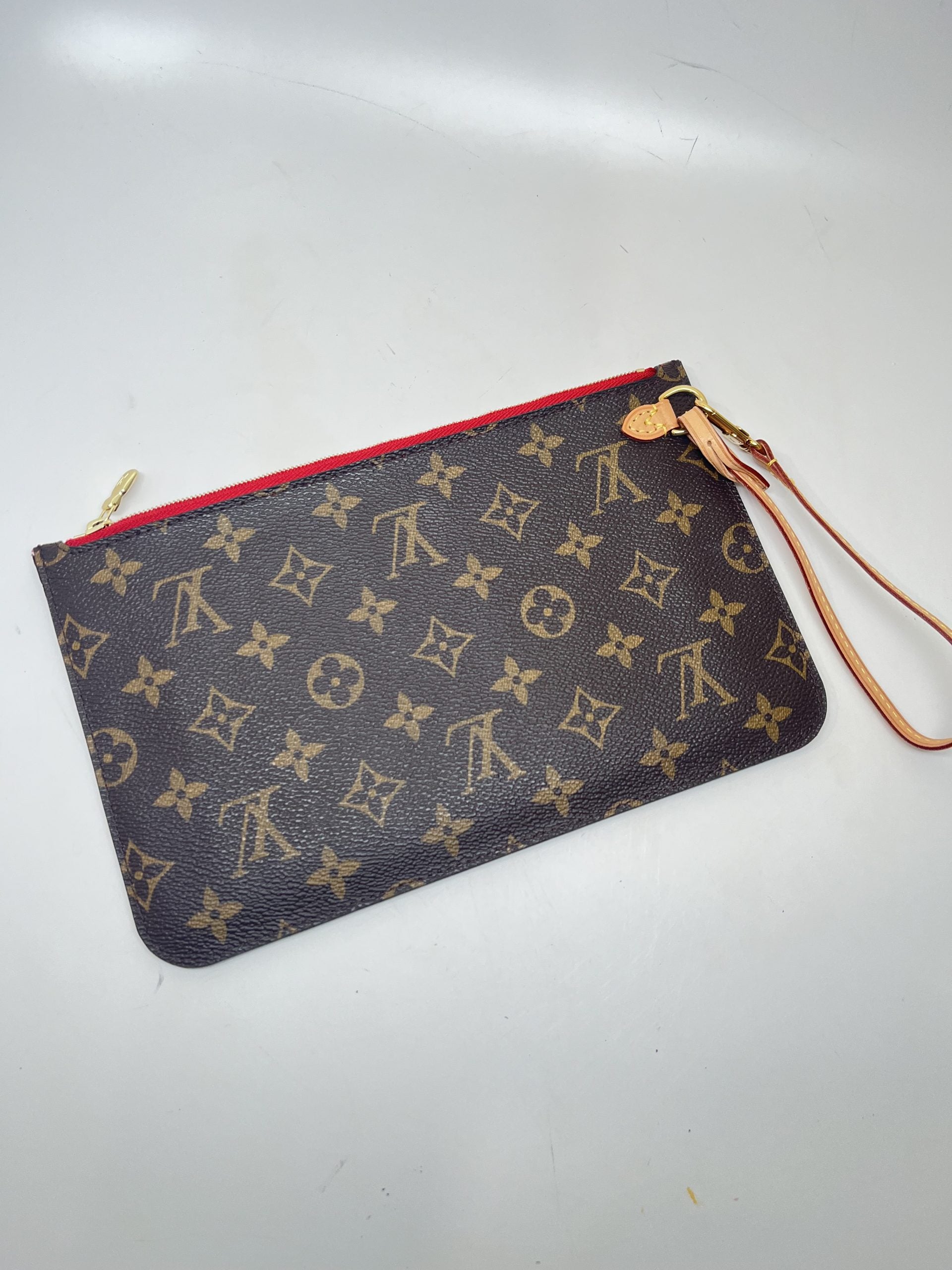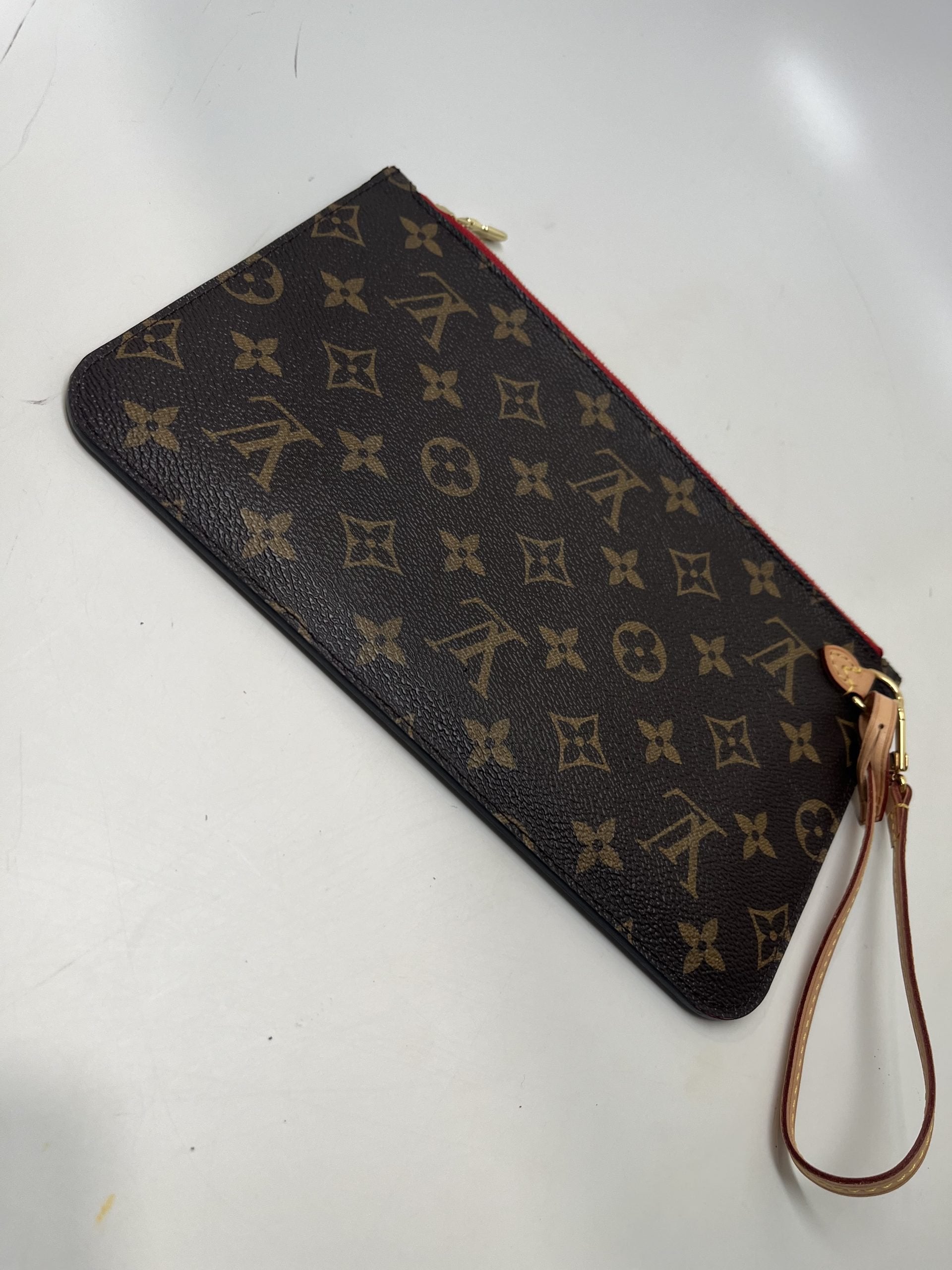 Signature Louis Vuitton Monogram Neverfull Pochette. An elegant clutch which can be worn from day to night as a wristlet or carried in a bag. At a fraction of the retail cost, this pochette has not been worn since purchased!