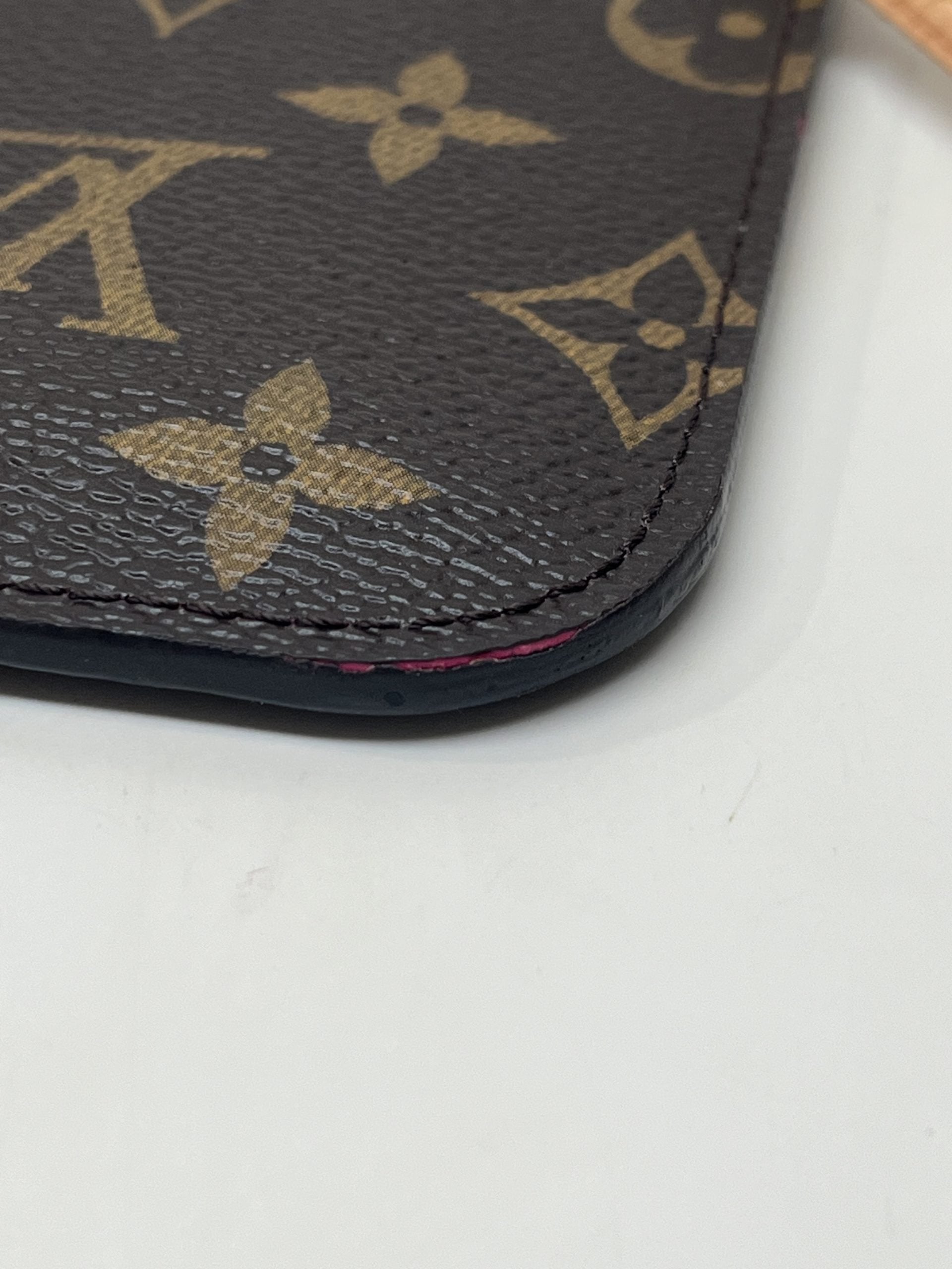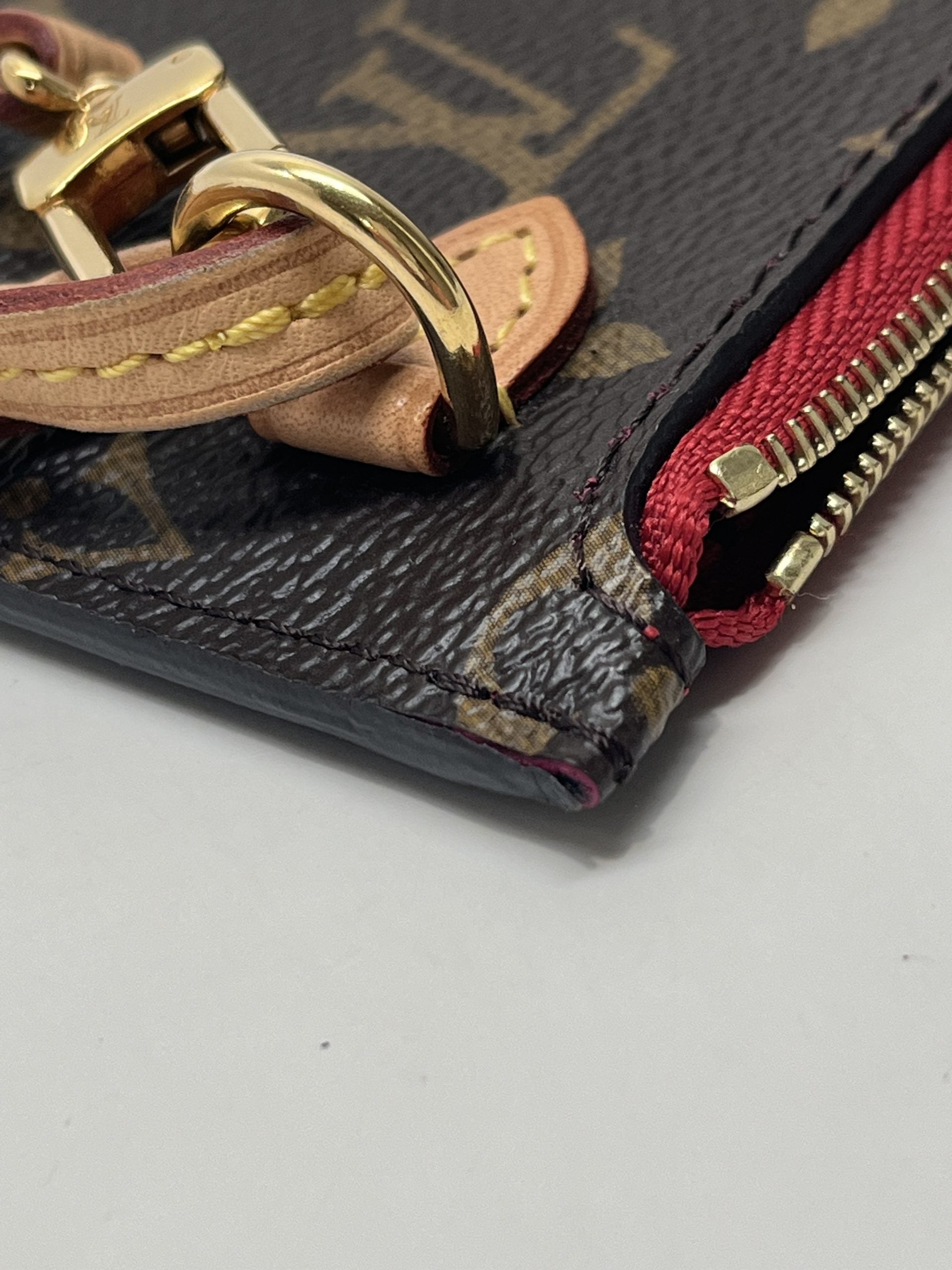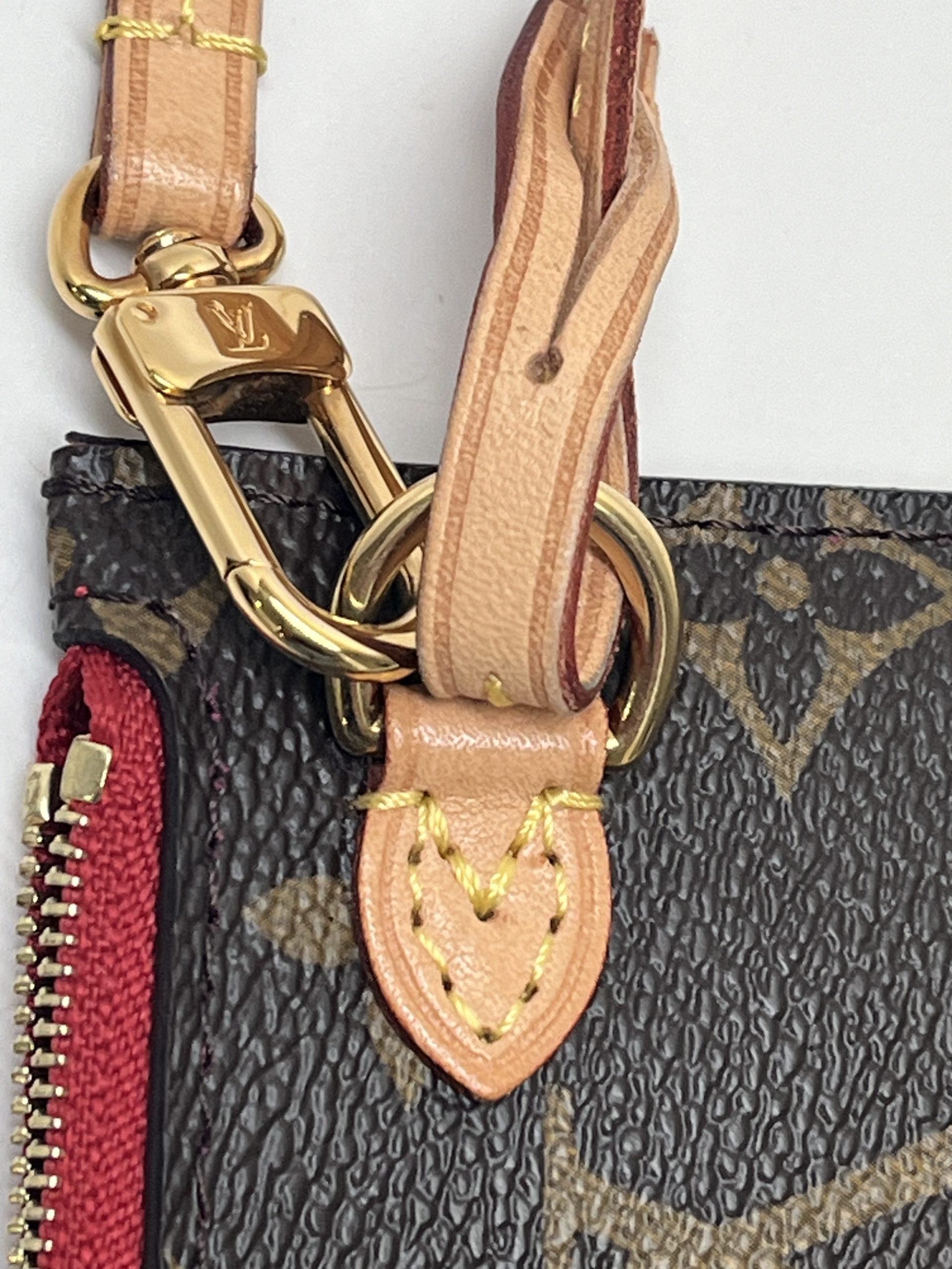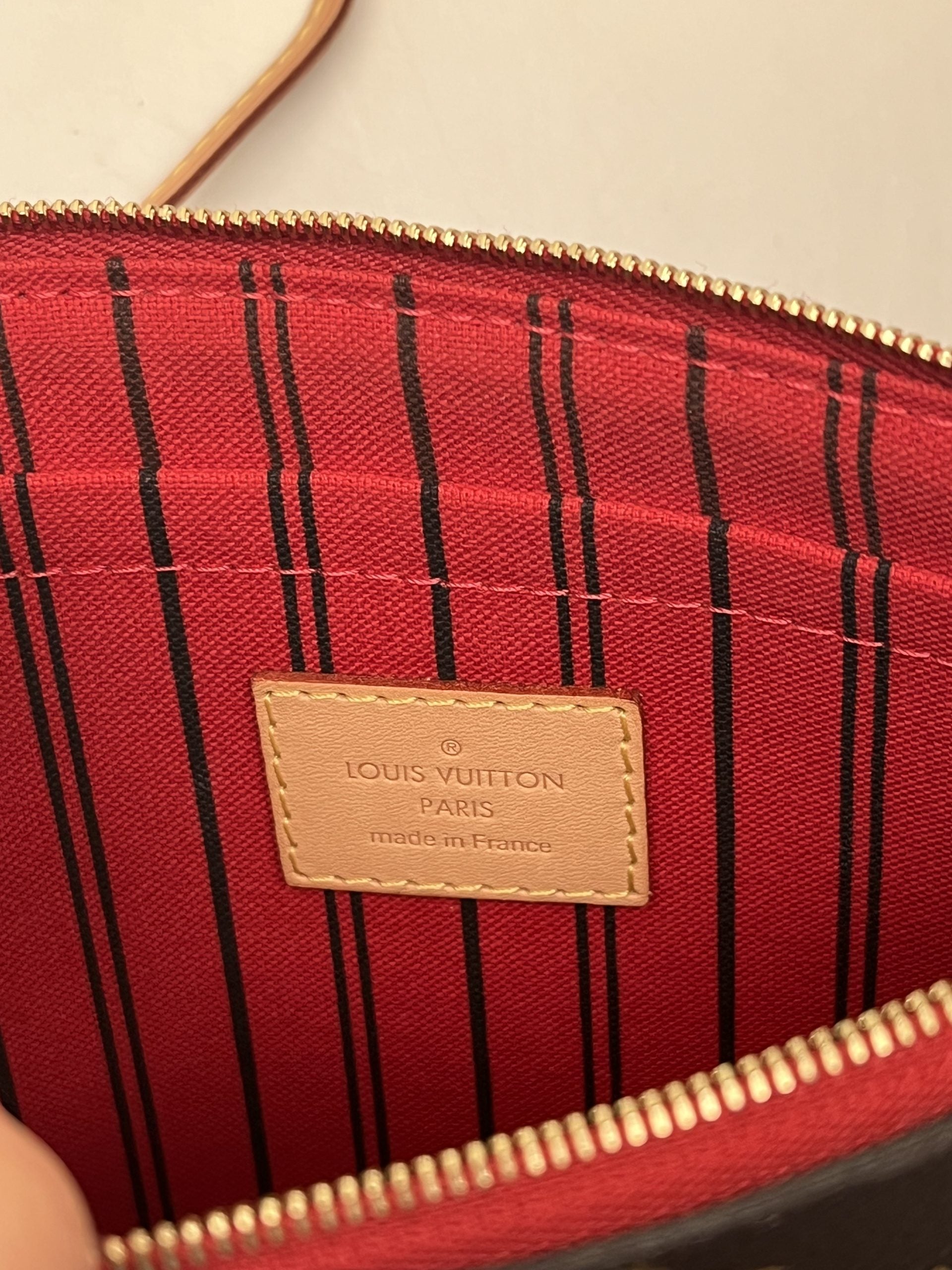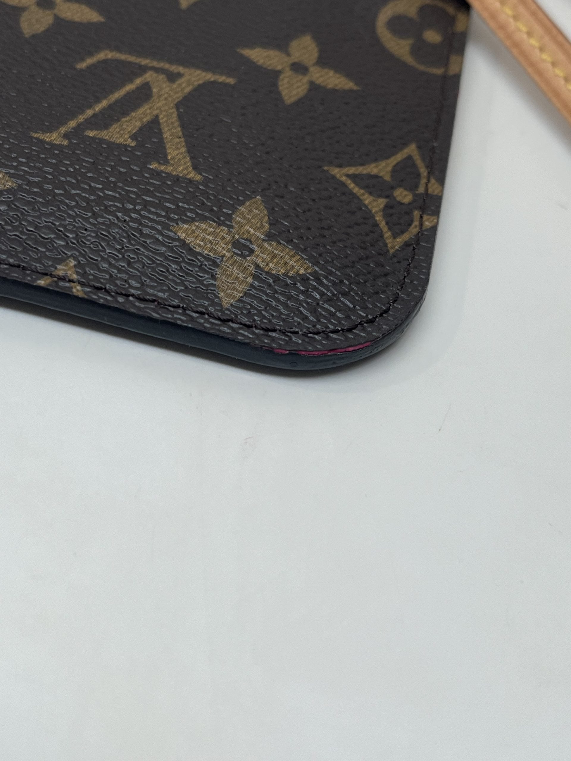 Signature Louis Vuitton Monogram Neverfull Pochette. An elegant clutch which can be worn from day to night as a wristlet or carried in a bag. At a fraction of the retail cost, this pochette has not been worn since purchased!