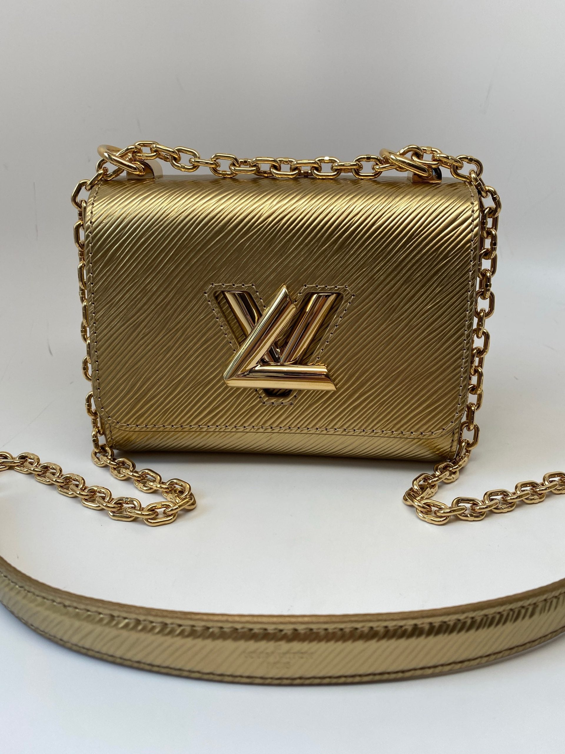 LV - "The Twist Mini handbag, with its modern interpretation of the classic LV Twist lock, is made from Epi grained leather with a sliding gold-tone chain. The new mini-version of the iconic Twist design is perfect for a day-to-evening use. Its ingeniously designed "wave" base expands to store extra necessities."-