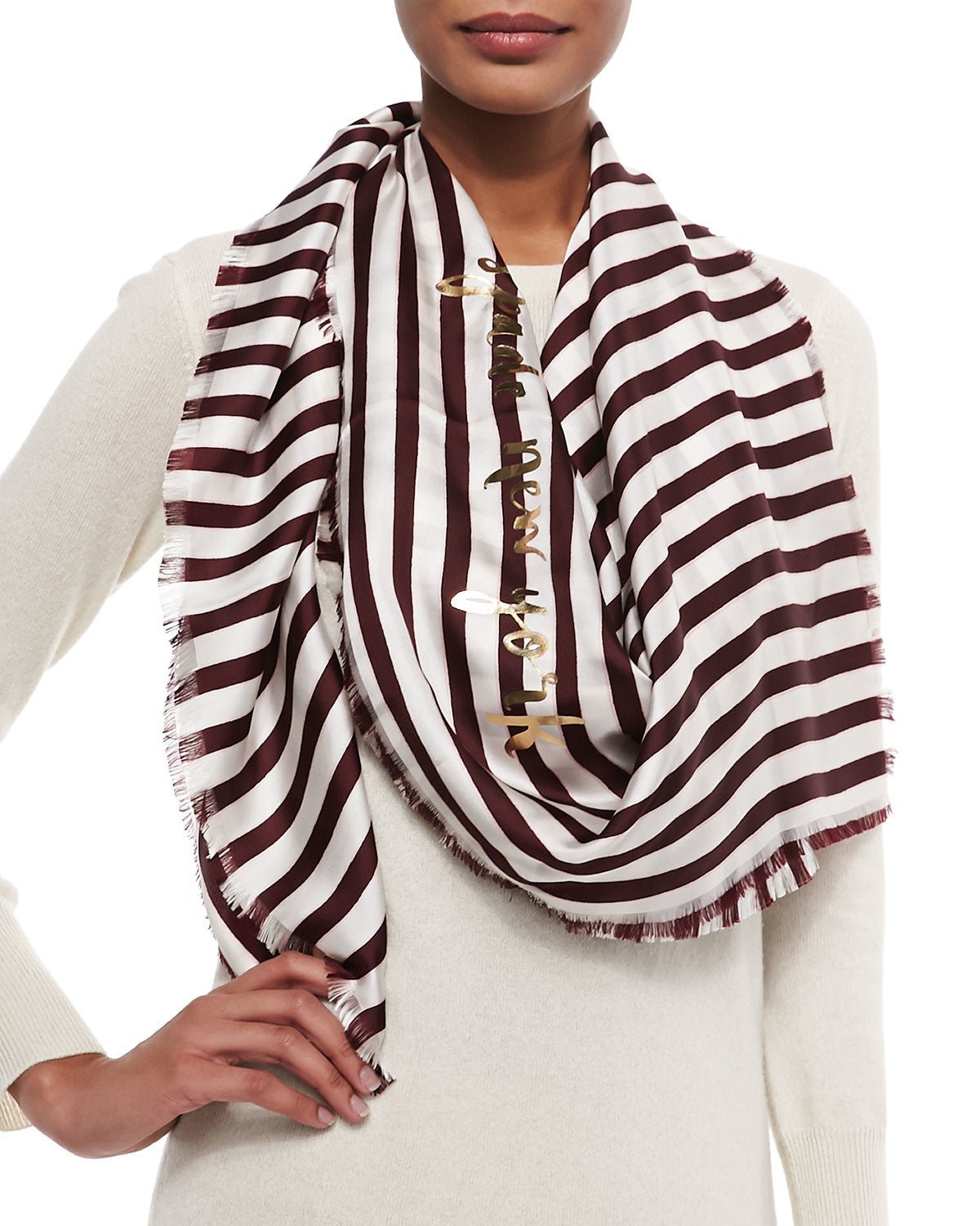 Details: Kate Spade New York planetary stripe silk scarf. Eyelash fringed edges. Gold foil Kate Spade New York logo. 100% silk 48" x 48" By Kate Spade New York; imported.Share