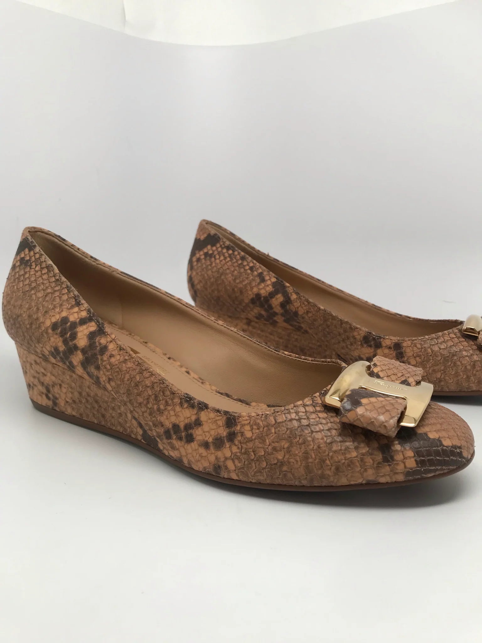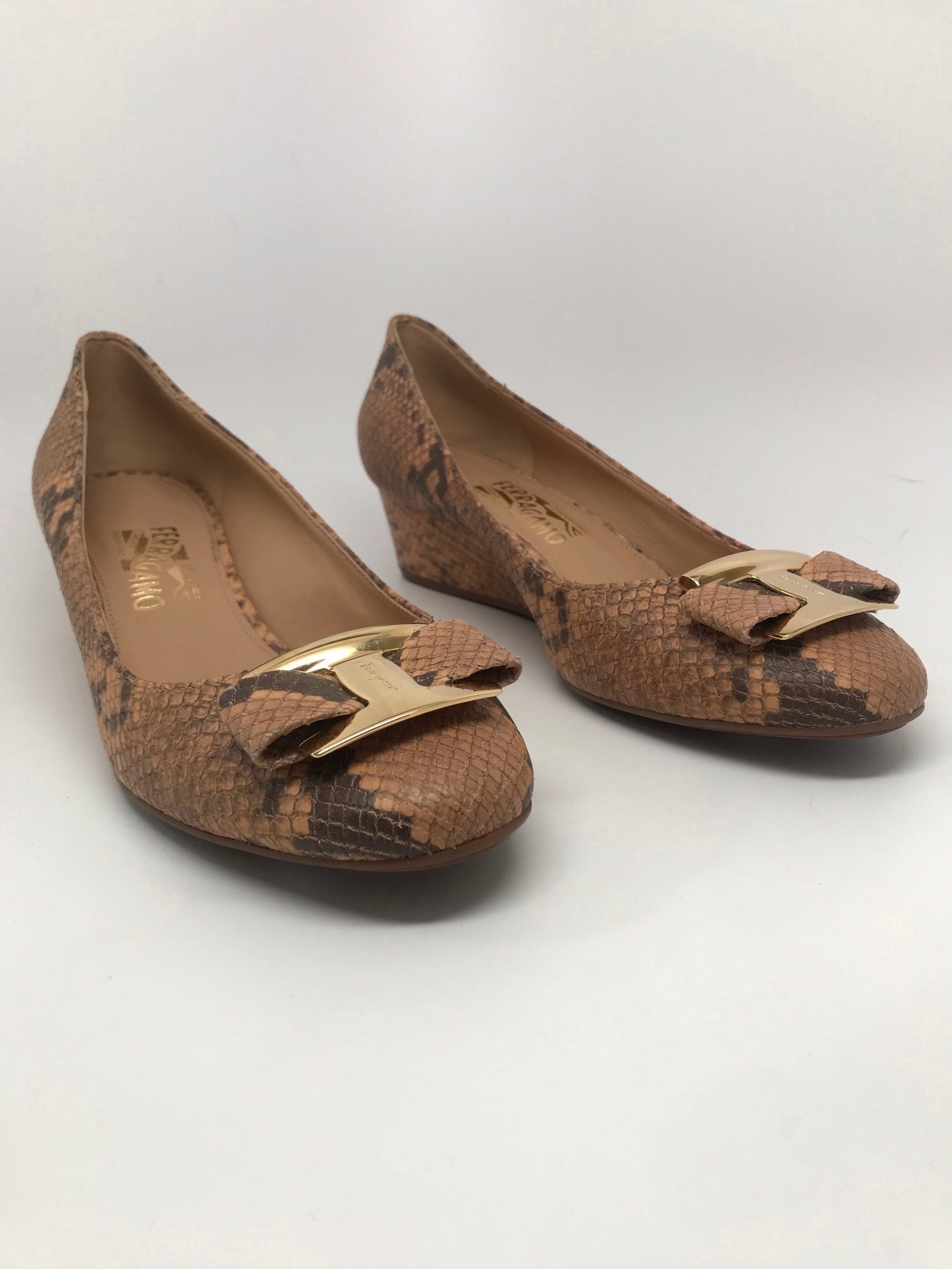 Details: Size 10 Heel Height: 1.8" Super chic wedge heel featuring decorative gold Ferragamo signature bow. Crafted out of python embossed leather, The uppers are lined with smooth leather for comfort and easy wear. These shoes are perfect for any fashionista. These beautiful shoes are a floor model - wear from try on, 9/10 condition. Come as is - no box or dust bag. 100% authentic guaranteed. By Salvatore Ferragamo; made in ItalyShare