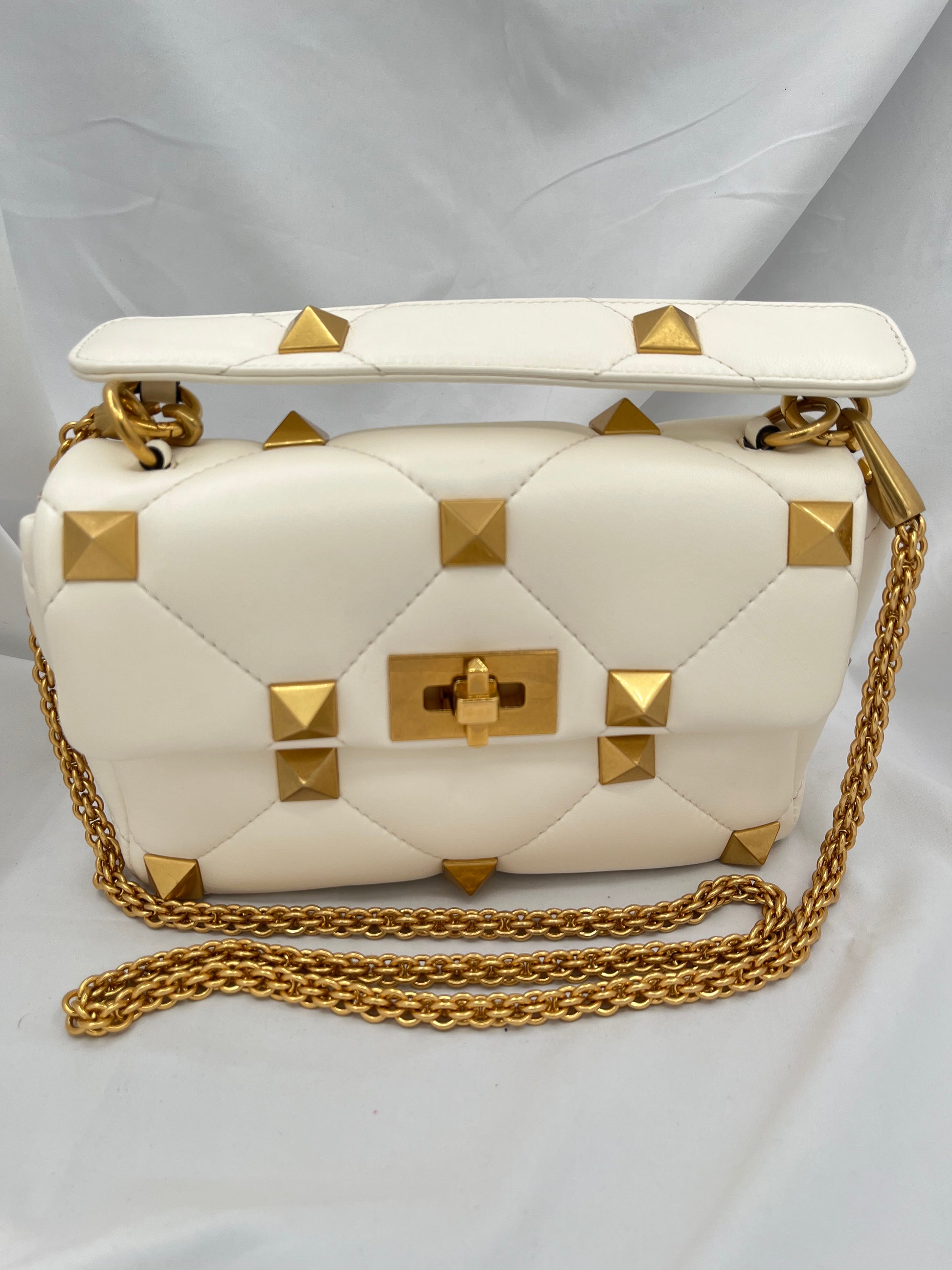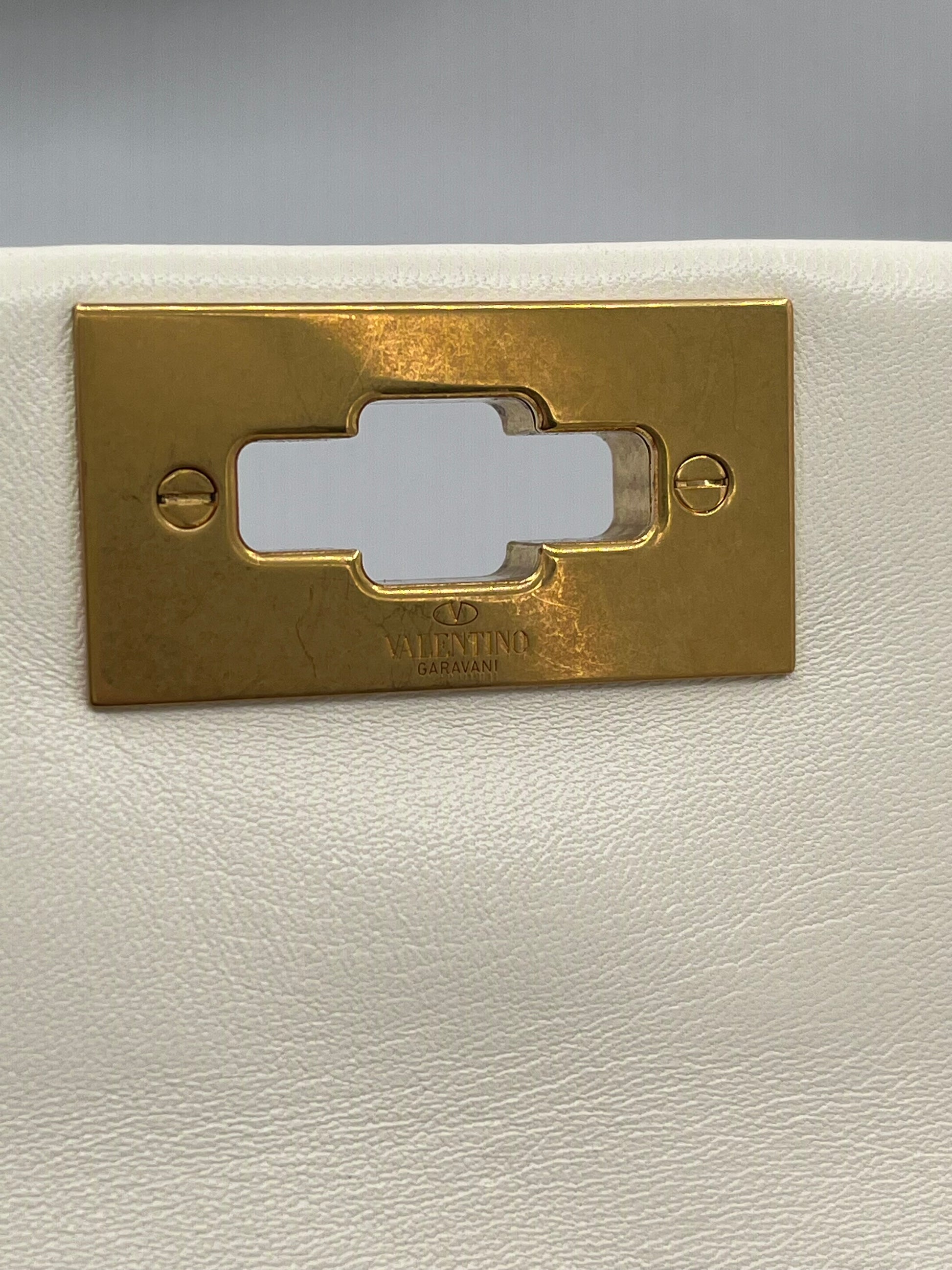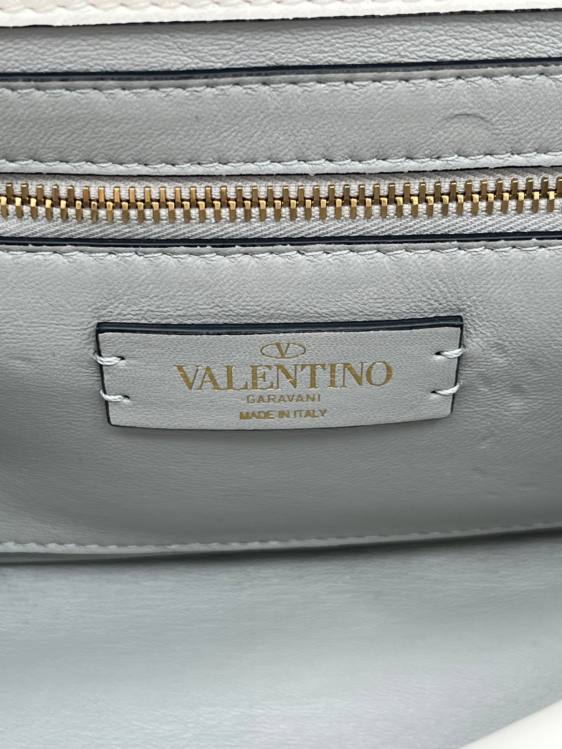 With its signature Valentino studs surrounding the bag, this beauty is sure to stand out! Its roomy interior and chic exterior features buttery calfskin, elegant top handle, and gold-tone removable shoulder strap. Versatile, elegant, and simple all in one. Wear this beauty over the shoulder, or top handle carry.